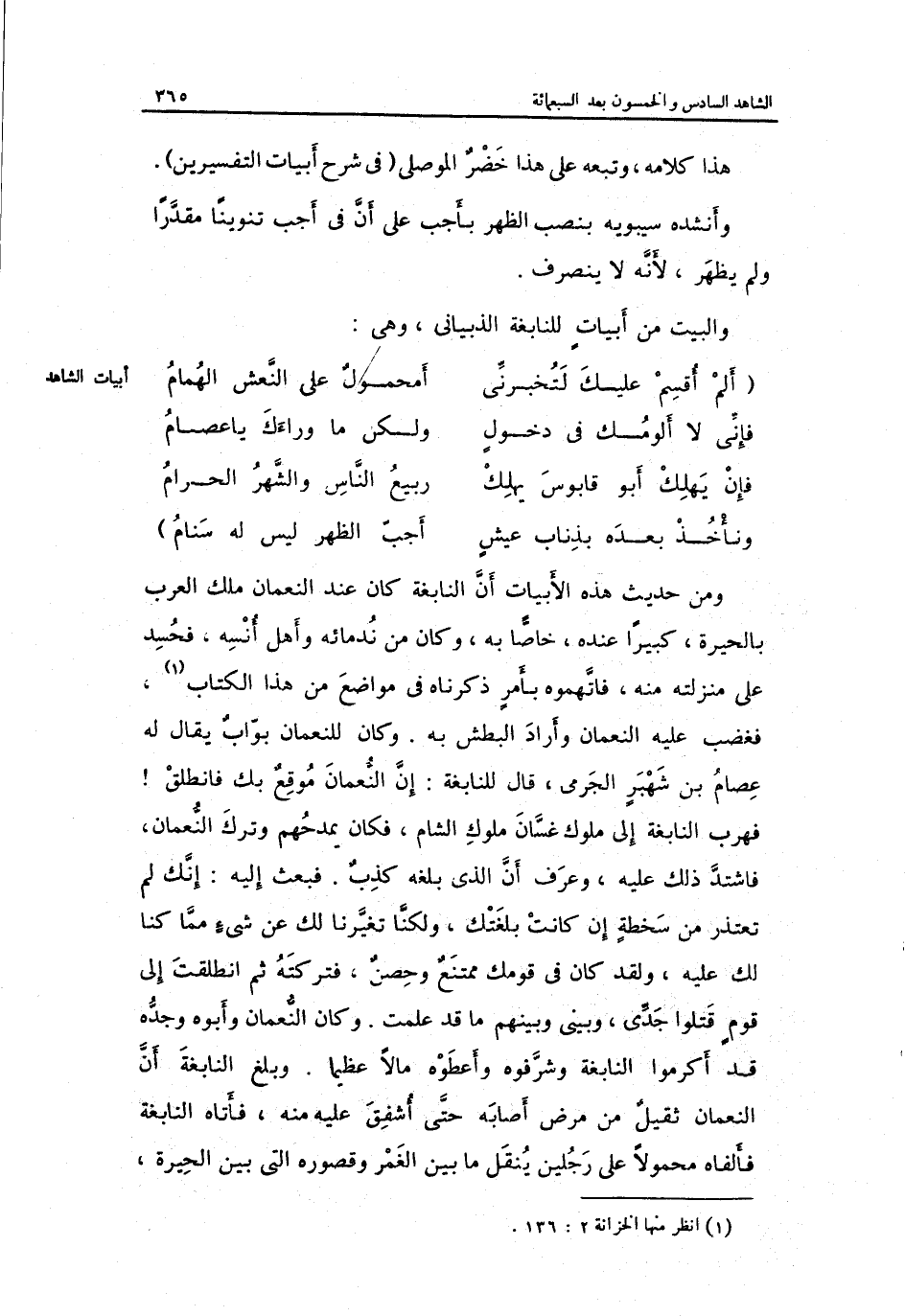 وَكَانَ النُّعْمَان وَأَبوهُ وجده قد أكْرمُوا النَّابِغَة وشرفوه وَأَعْطوهُ مَالا عَظِيما. وَبلغ النَّابِغَة أَن النُّعْمَان ثقيل من مرض أَصَابَهُ حَتَّى أشْفق عَلَيْهِ مِنْهُ فَأَتَاهُ النَّابِغَة فَأَلْقَاهُ مَحْمُولا على رجلَيْنِ ينْقل)