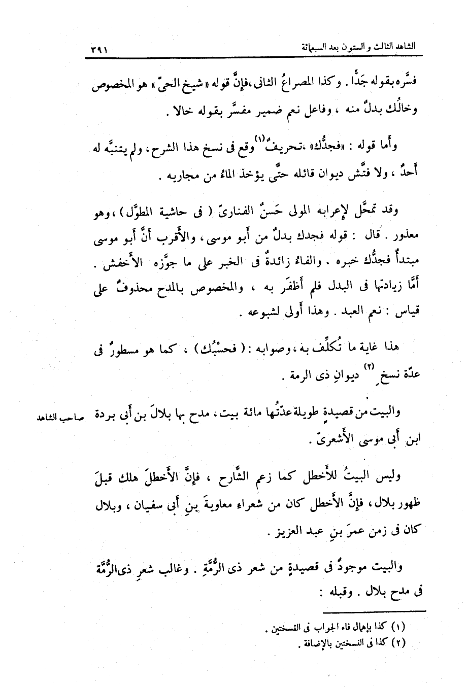 وَقد تمحل لإعرابه الْمولى حسن الفناري فِي حَاشِيَة المطول وَهُوَ مَعْذُور. قَالَ: قَوْله: فجدك بدل من أَبُو مُوسَى وَالْأَقْرَب أَن أَبُو مُوسَى مُبْتَدأ فجدك خَبره وَالْفَاء زَائِدَة فِي الْخَبَر على مَا جوزه الْأَخْفَش. أما زيادتها فِي الْبَدَل فَلم أظفر بِهِ والمخصوص بالمدح مَحْذُوف على قِيَاس نعم العَبْد. وَهَذَا أولى لشيوعه.
