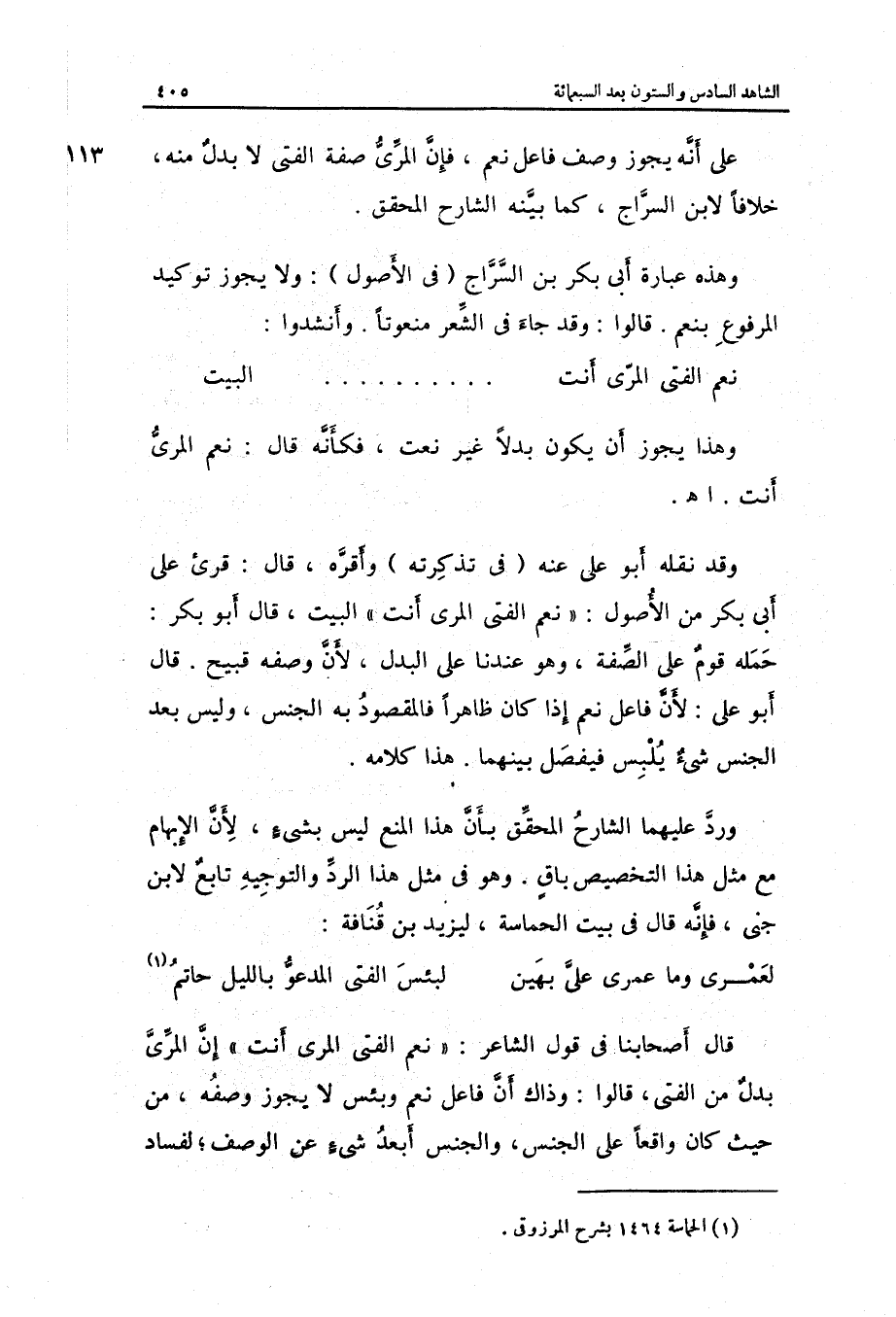 وأنشدوا: نعم الْفَتى المري أَنْت ... ... ... ... الْبَيْت وَهَذَا يجوز أَن يكون بَدَلا غير نعت فَكَأَنَّهُ قَالَ: نعم المري أَنْت. اه.