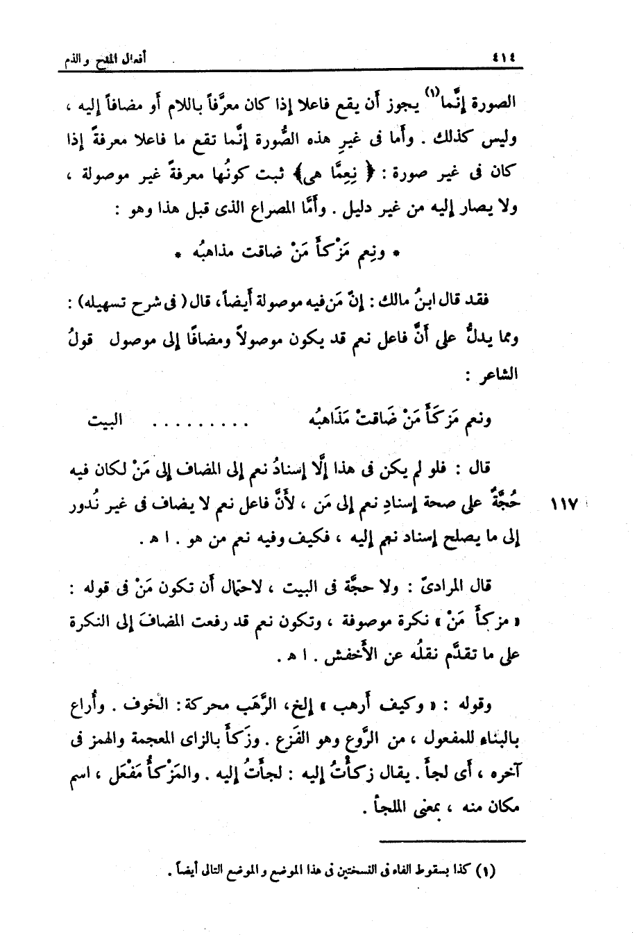نعم إِلَى مَن لِأَن فَاعل نعم لَا يُضَاف فِي غير ندور إِلَى مَا يصلح إِسْنَاد نعم إِلَيْهِ فَكيف وَفِيه نعم قَالَ الْمرَادِي: وَلَا حجَّة فِي الْبَيْت لاحْتِمَال أَن تكون من فِي قَوْله: مزكأ مَن نكرَة مَوْصُوفَة وَتَكون نعم قد رفعت الْمُضَاف إِلَى النكرَة على مَا تقدم نَقله عَن الْأَخْفَش. اه.
