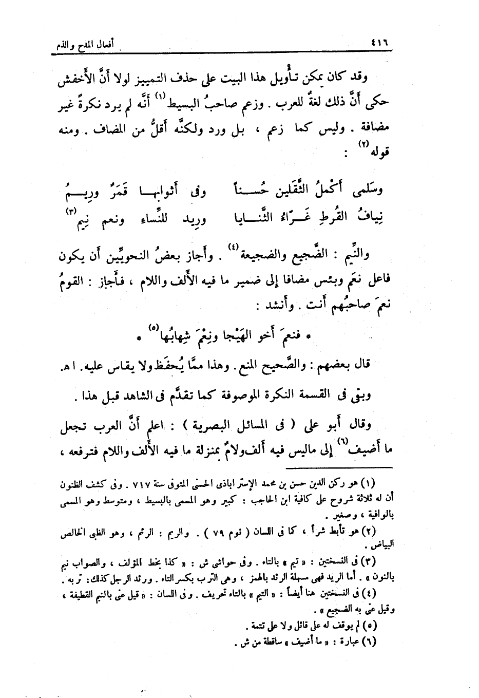 فَنعم أَخُو الهيجا وَنعم شهابها قَالَ بَعضهم: وَالصَّحِيح الْمَنْع. وَهَذَا مِمَّا يحفظ وَلَا يُقَاس عَلَيْهِ. اه.