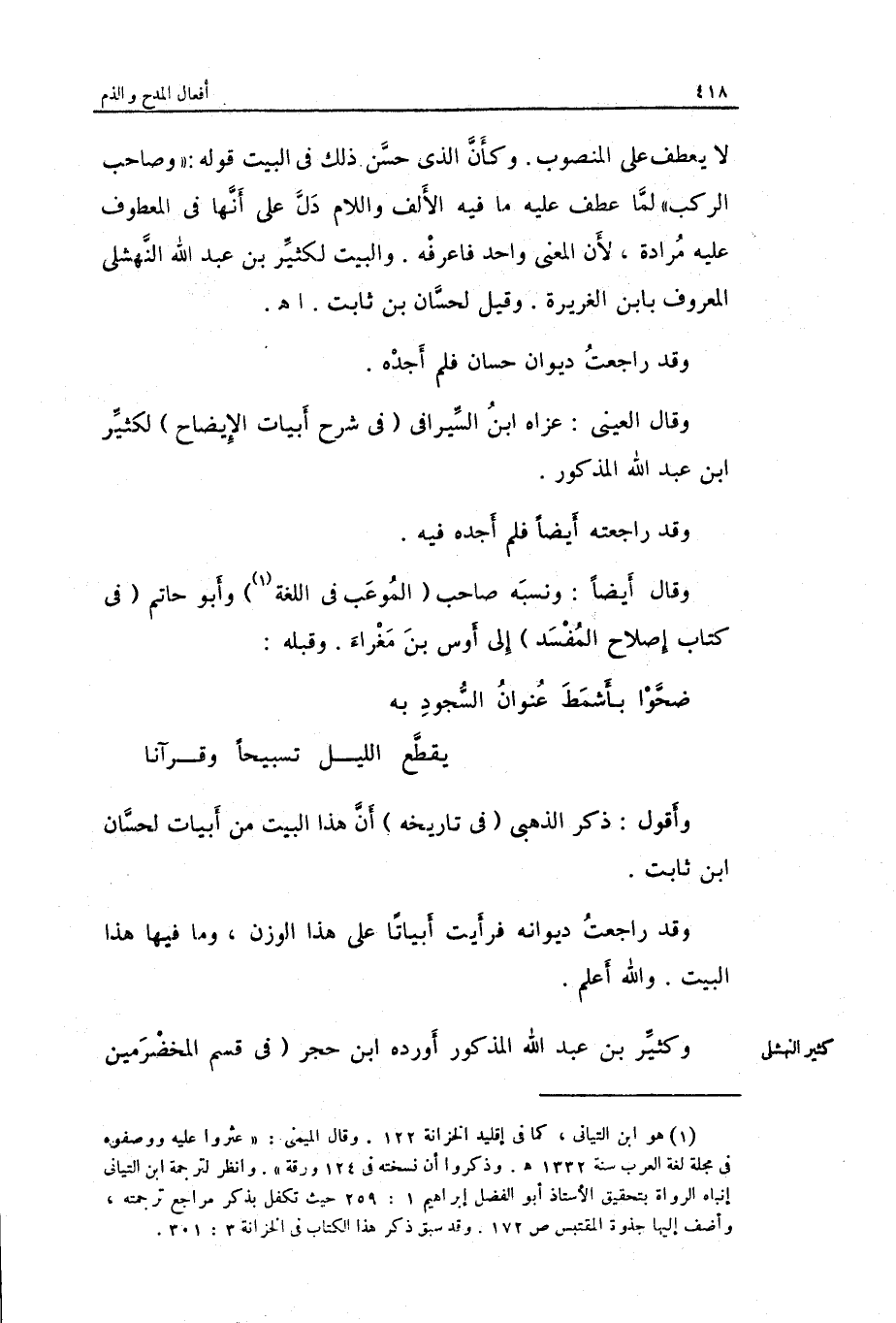 وَقَالَ الْعَيْنِيّ: عزاهُ ابْن السيرافي فِي شرح أَبْيَات الْإِيضَاح لكثير بن عبد الله الْمَذْكُور.