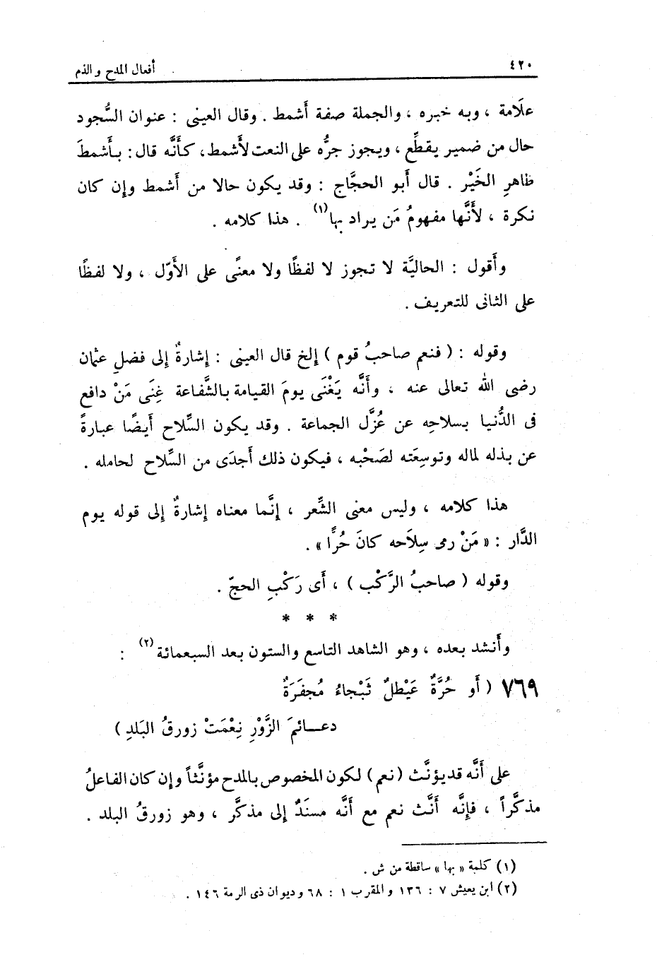 وَقَوله: فَنعم صَاحب قوم ... إِلَخ قَالَ الْعَيْنِيّ: إِشَارَة إِلَى فضل عُثْمَان رَضِي الله تَعَالَى عَنهُ وَأَنه يُغني يَوْم الْقِيَامَة بالشفاعة غنى من دَافع فِي الدُّنْيَا بسلاحه عَن عزل الْجَمَاعَة. وَقد يكون هَذَا كَلَامه.