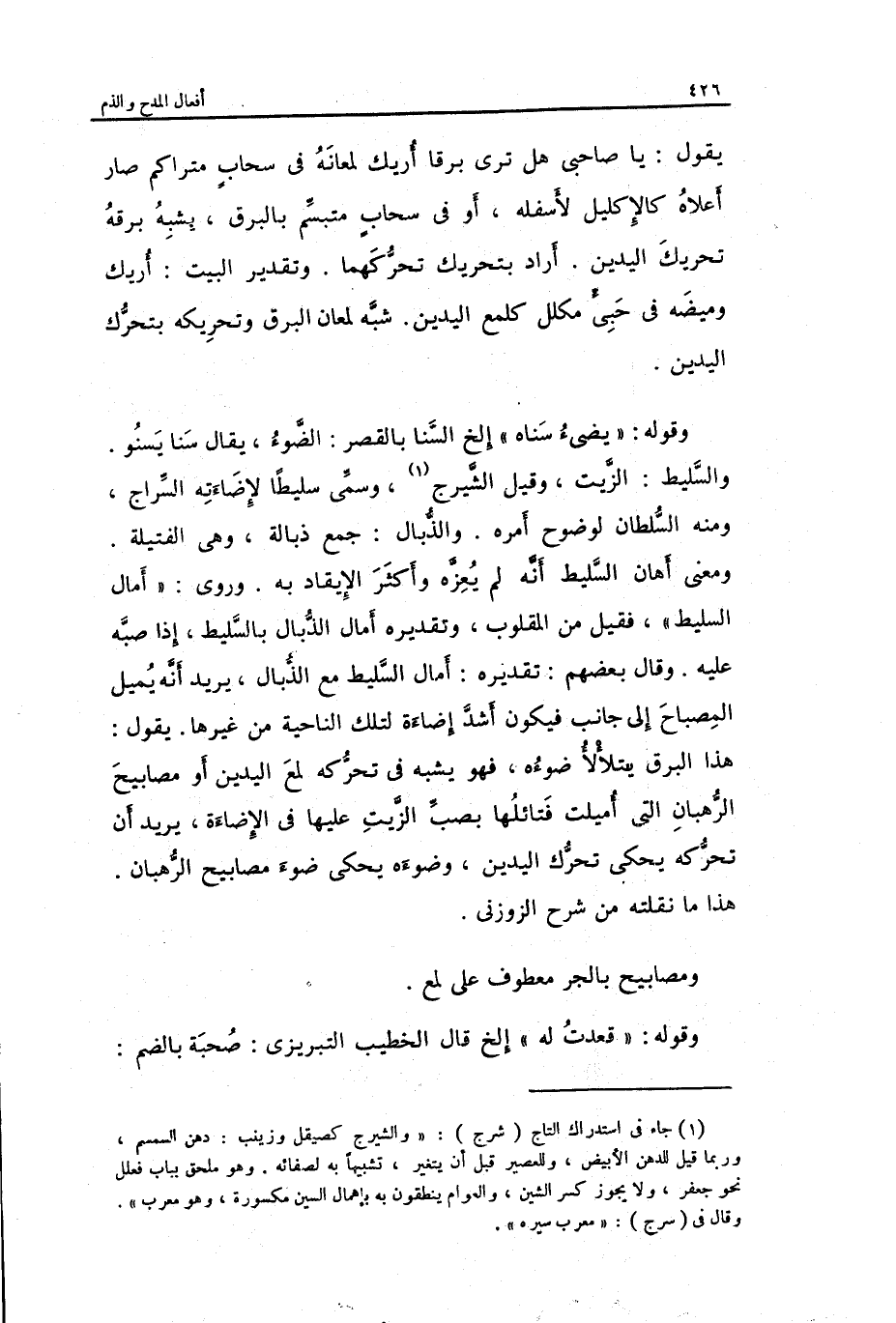 وَقَوله: يضيء سناه ... إِلَخ السنا بِالْقصرِ: الضَّوْء يُقَال: سنا يسنو. والسليط: الزَّيْت وَقيل: الشيرج وَسمي سليطاً لإضاءته السراج وَمِنْه السُّلْطَان لوضوح أمره.