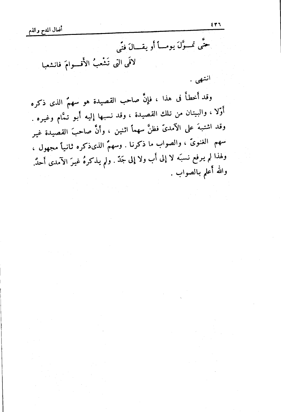 وَقد أَخطَأ فِي هَذَا فَإِن صَاحب القصيدة هُوَ سهم الَّذِي ذكره أَولا والبيتان من تِلْكَ القصيدة وَقد نَسَبهَا إِلَيْهِ أَبُو تَمام وَغَيره. وَقد اشْتبهَ على الْآمِدِيّ فَظن سَهْما اثْنَيْنِ وَأَن صَاحب القصيدة غير سهم الغنوي وَالصَّوَاب مَا ذكرنَا. وَسَهْم الَّذِي ذكره ثَانِيًا مَجْهُول وَلِهَذَا لم يرفع نسبه لَا إِلَى أَب وَلَا إِلَى جد. وَلم يذكرهُ غير الْآمِدِيّ أحد. وَالله أعلم بِالصَّوَابِ.