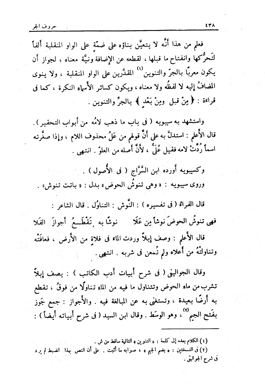فَعلم من هَذَا أَنه لَا يتَعَيَّن بناؤها على ضمة على الْوَاو المنقلبة ألفا لتحركها وانفتاح مَا قبلهَا لقطعه عَن الْإِضَافَة وَنِيَّة مَعْنَاهُ لجَوَاز أَن يكون معرباً بِالْجَرِّ والتنوين المقدرين على الْوَاو المنقلبة وَلَا ينوى الْمُضَاف إِلَيْهِ لَا لَفظه وَلَا مَعْنَاهُ وَيكون كَسَائِر الْأَسْمَاء النكرَة كَمَا فِي قِرَاءَة: من قبلُ وَمن بعد بِالْجَرِّ والتنوين.