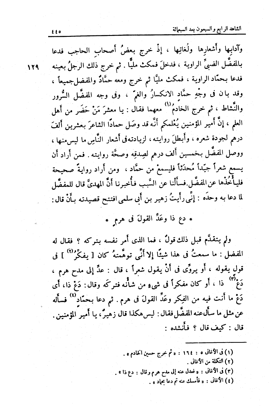 فسألنا عَن السَّبَب فَأخْبرنَا أَن الْمهْدي قَالَ للمضل لما دَعَا بِهِ وَحده: إِنِّي رَأَيْت زُهَيْر بن أبي سلمى افْتتح قصيدته بِأَن قَالَ: دع ذَا وعد القَوْل فِي هرم