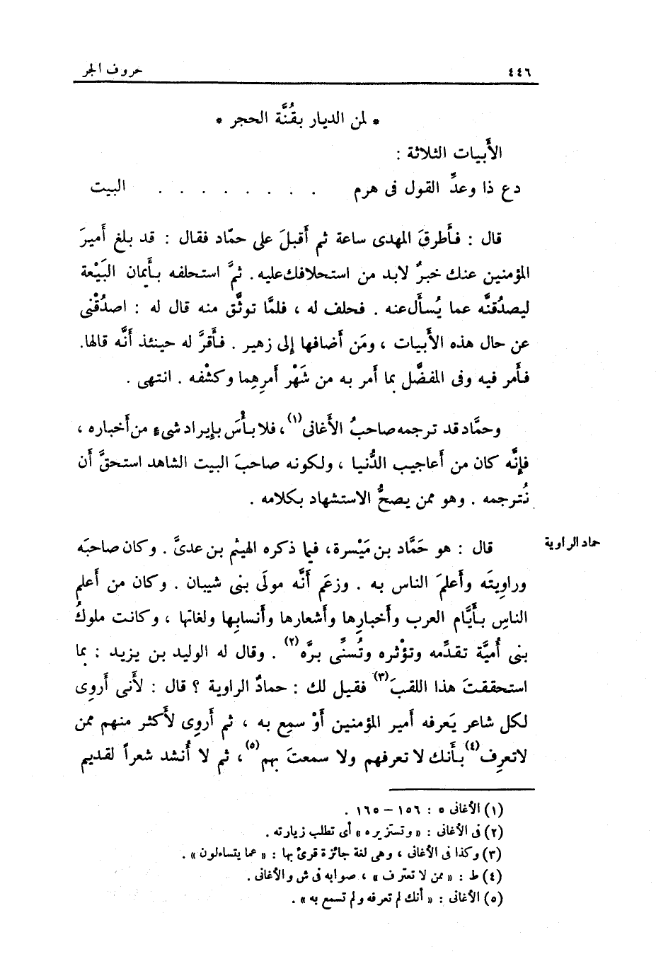 وَحَمَّاد قد تَرْجمهُ صَاحب الأغاني فَلَا بَأْس بإيراد شَيْء من أخباره فَإِنَّهُ كَانَ من أَعَاجِيب الدُّنْيَا ولكونه صَاحب الْبَيْت الشَّاهِد اسْتحق أَن نترجمه. وَهُوَ مِمَّن يَصح الاستشهاد بِكَلَامِهِ.