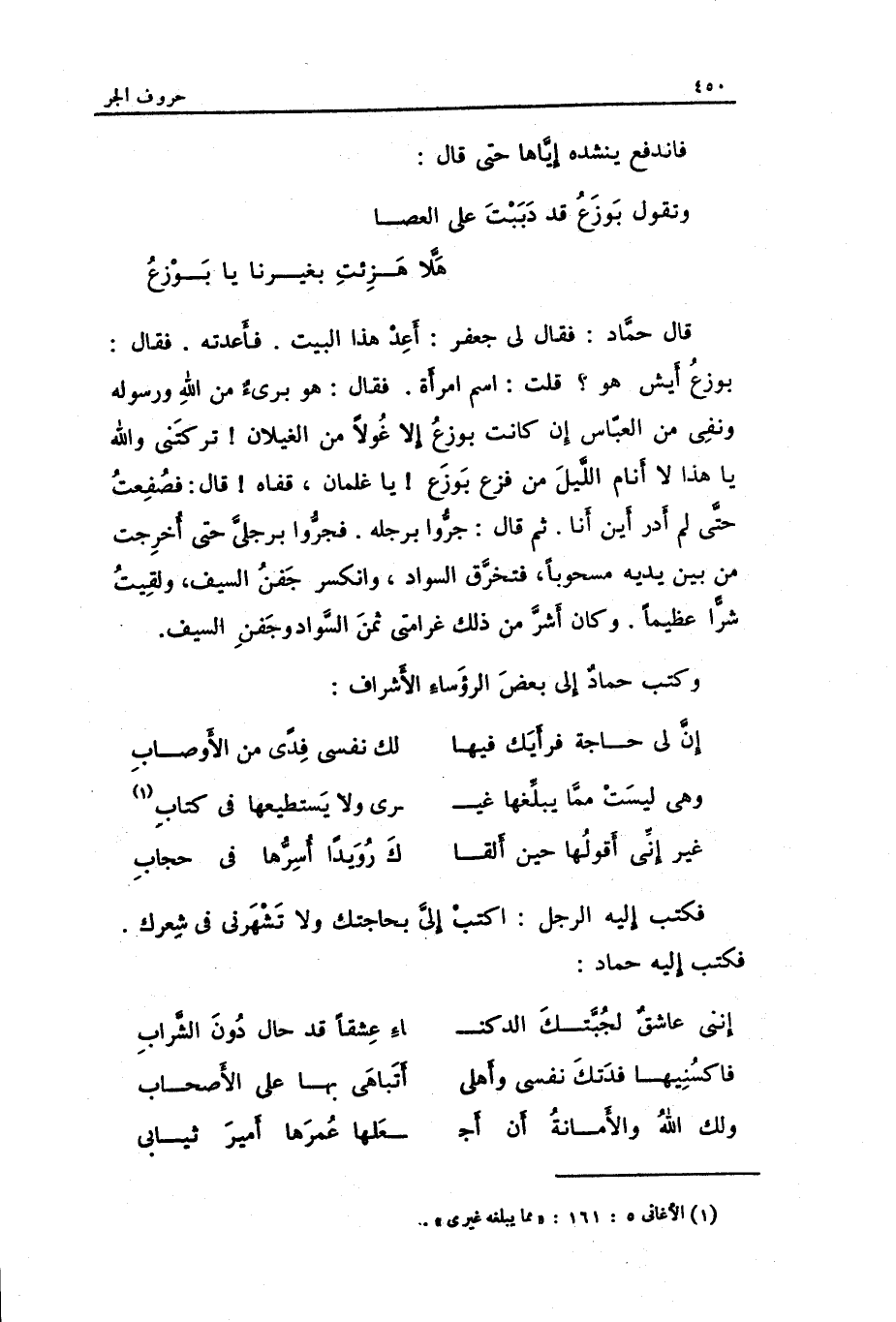 قَالَ حَمَّاد: فَقَالَ: لي جَعْفَر: أعد هَذَا الْبَيْت. فأعدته. فَقَالَ: بوزع أيش هُوَ قلت: اسْم امْرَأَة. فَقَالَ: هُوَ بَرِيء من الله وَرَسُوله وَنفي من الْعَبَّاس إِن كَانَت بوزع إِلَّا غولاً من الغيلان تَرَكتنِي وَالله يَا هَذَا لَا أَنَام اللَّيْل من فزع بوزع يَا غلْمَان قَفاهُ قَالَ: فصغت حَتَّى لم أدر أَيْن أَنا.
