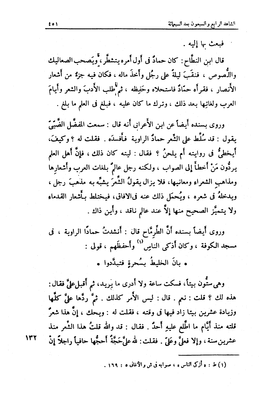 وروى بِسَنَدِهِ أَيْضا عَن ابْن الْأَعرَابِي أَنه قَالَ: سَمِعت الْمفضل الضَّبِّيّ يَقُول: قد سلط على الشّعْر حَمَّاد الراوية فأفسده. فَقلت لَهُ: وَكَيف أيخطئ فِي رِوَايَته أم يلحن فَقَالَ: ليته كَانَ ذَلِك فَإِن أهل الْعلم يردون من أَخطَأ إِلَى الصَّوَاب وَلكنه رجل عَالم بلغات الْعَرَب وَأَشْعَارهَا ومذاهب الشُّعَرَاء ومعانيها فَلَا يزَال يَقُول الشّعْر يشبه بِهِ مَذْهَب رجل ويدخله فِي شعره وَيحمل ذَلِك عَنهُ فِي الْآفَاق فيختلط بأشعار القدماء وَلَا يتَمَيَّز الصَّحِيح مِنْهَا إِلَّا عِنْد عَالم ناقد وَأَيْنَ ذَاك.
