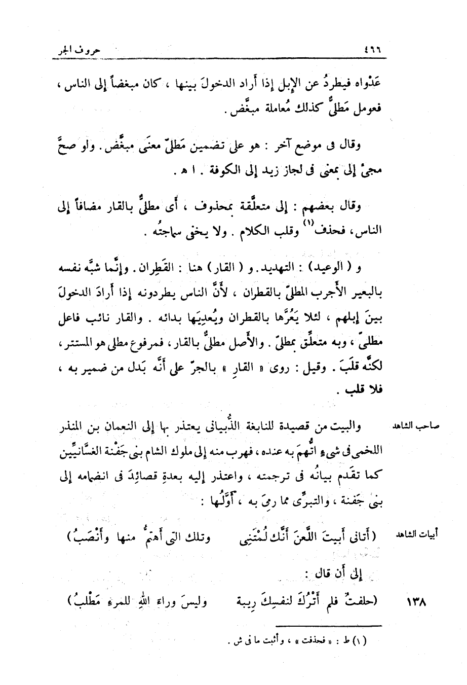 وَقَالَ فِي مَوضِع آخر: هُوَ على تضمين مَطْلِي معنى مبغض. وَلَو صَحَّ مَجِيء إِلَى بِمَعْنى فِي لجَاز زيد إِلَى الْكُوفَة. اه.