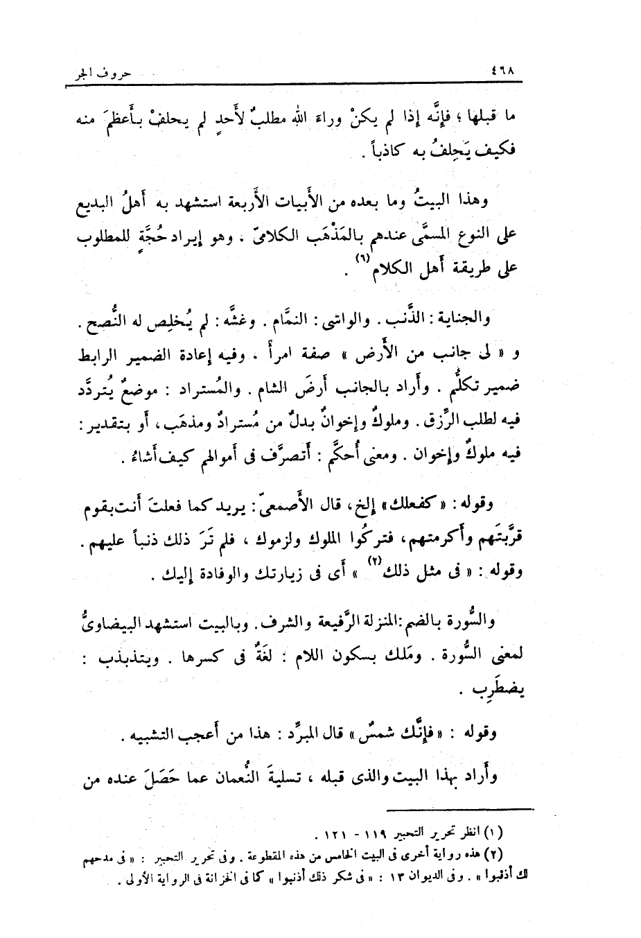 وَهَذَا الْبَيْت وَمَا بعده من الأبيات الْأَرْبَعَة اسْتشْهد بِهِ أهل البديع على النَّوْع الْمُسَمّى عِنْدهم بِالْمذهبِ الكلامي وَهُوَ إِيرَاد حجَّة للمطلوب على طَريقَة أهل الْكَلَام.