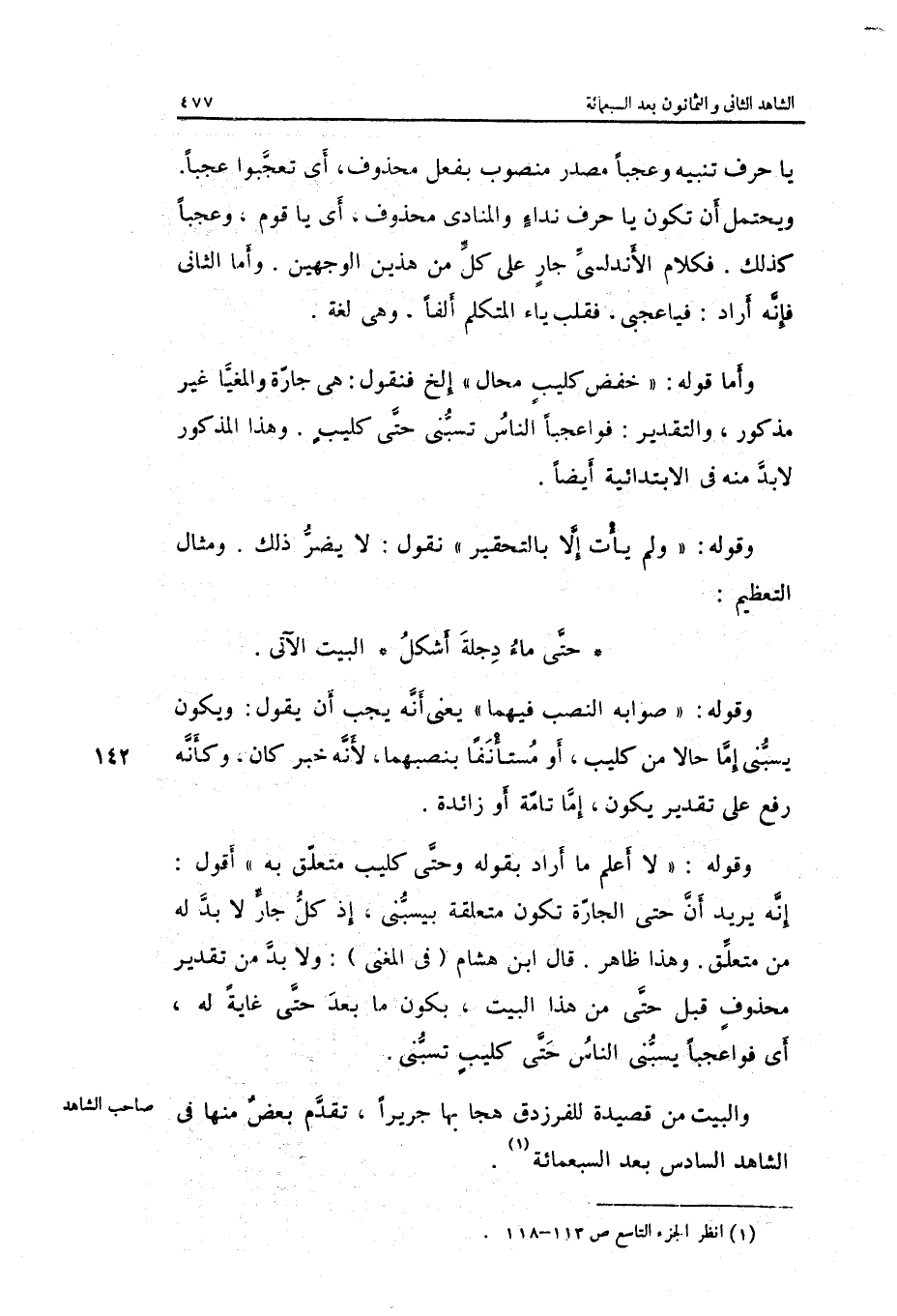 قَالَ ابْن هِشَام فِي الْمُغنِي: وَلَا بُد من تَقْدِير مَحْذُوف قبل حَتَّى من هَذَا الْبَيْت بِكَوْن مَا بعد وَالْبَيْت من قصيدة للفرزدق هجا بهَا جَرِيرًا تقدم بعض مِنْهَا فِي الشَّاهِد السَّادِس بعد السبعمائة.