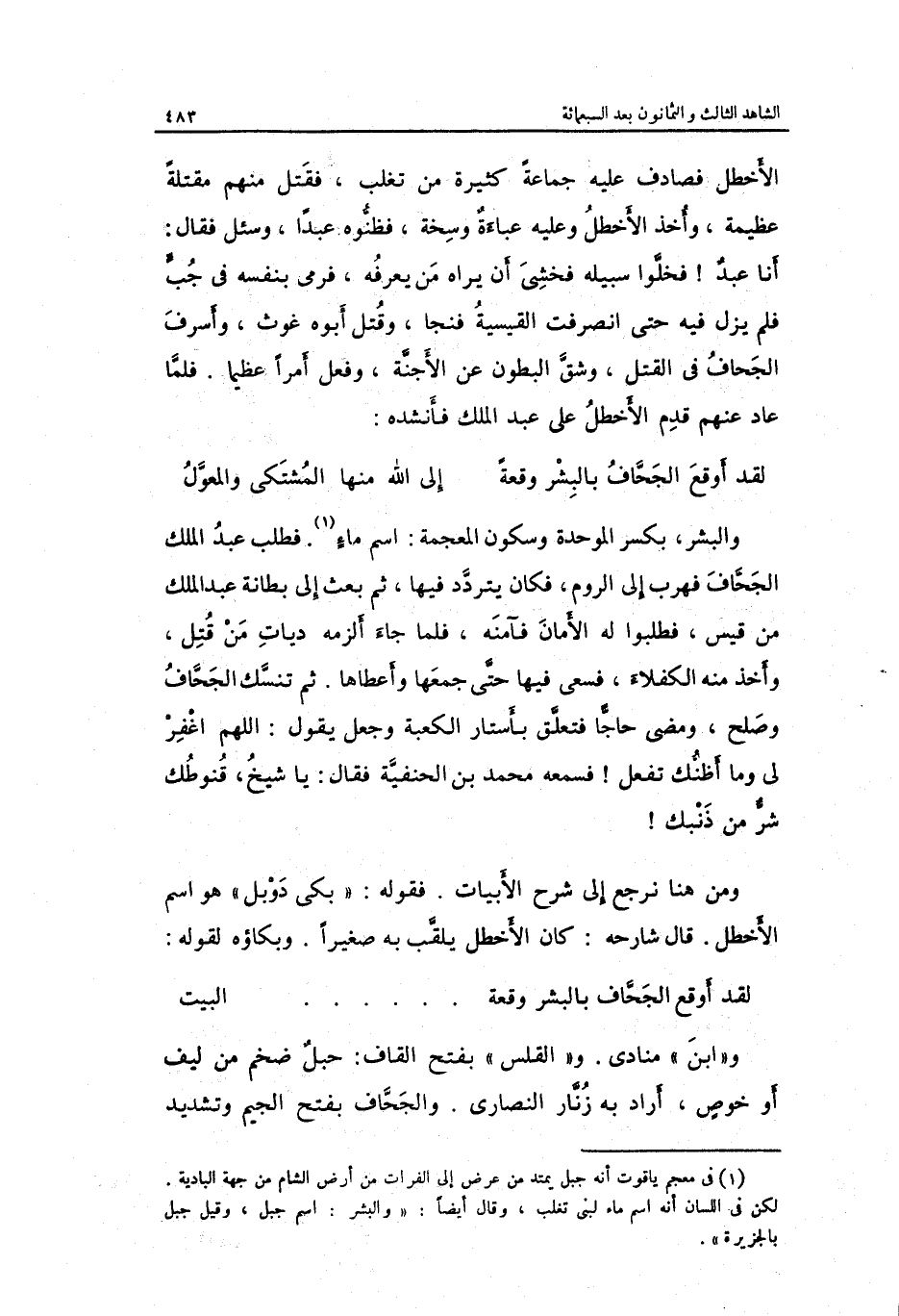 الأخطل فصادف عَلَيْهِ جمَاعَة كَثِيرَة من تغلب فَقتل مِنْهُم مقتلة عَظِيمَة وَأخذ الأخطل وَعَلِيهِ عبائة وسخة فظنوه عبدا وَسُئِلَ فَقَالَ: أَنا عبد فَخلوا سَبيله