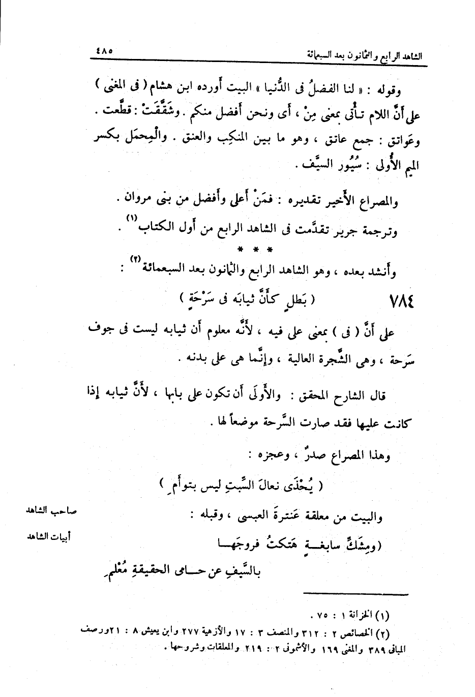 وَأنْشد بعده الْكَامِل بَطل كَأَن ثِيَابه فِي سرحة على أَن فِي بِمَعْنى على فِيهِ لِأَنَّهُ مَعْلُوم أَن ثِيَابه لَيست فِي جَوف سرحة وَهِي الشَّجَرَة الْعَالِيَة وَإِنَّمَا هِيَ على بدنه.