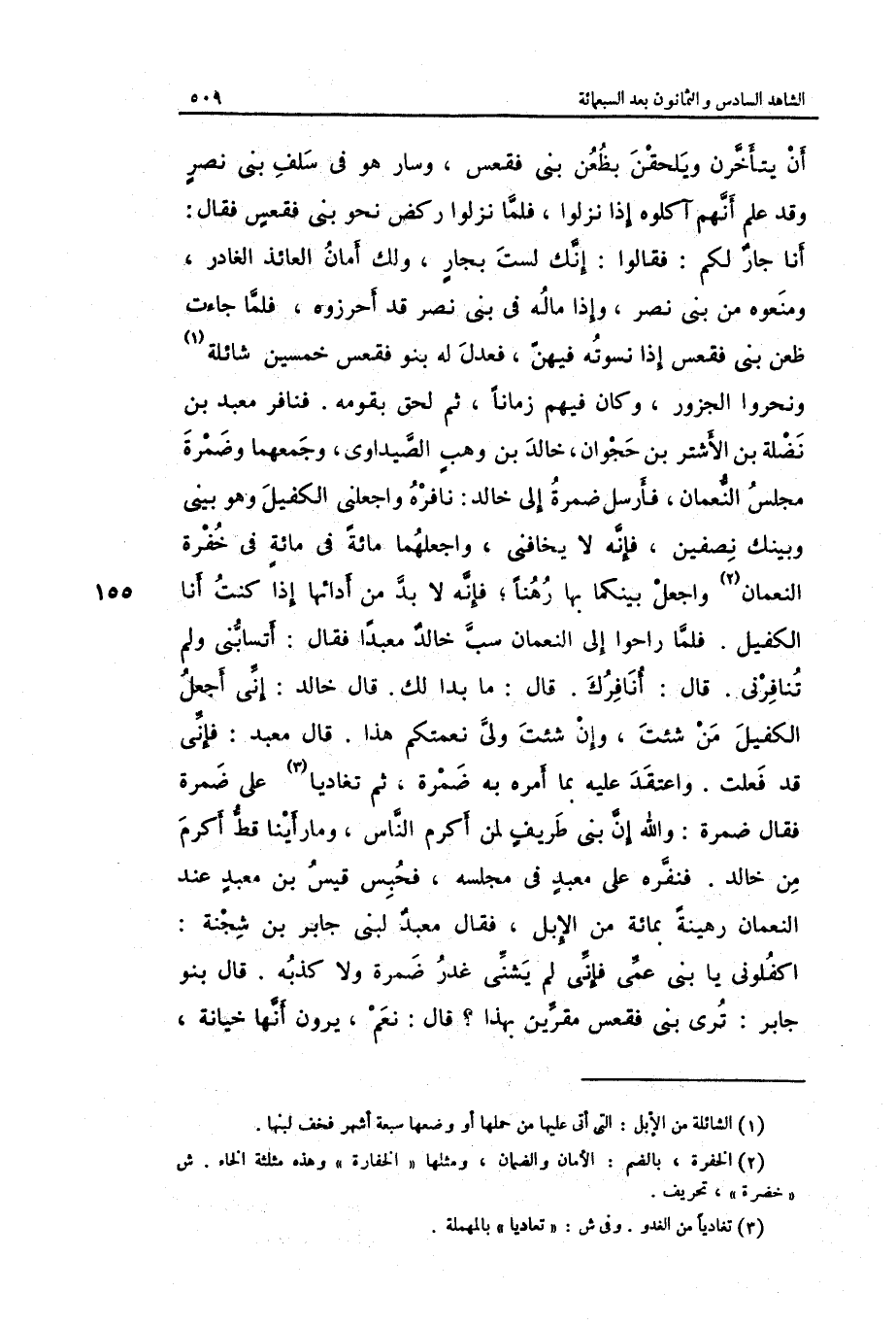 فنافر معبد بن نَضْلَة بن الأشتر بن حجوان خَالِد بن وهب الصَّيْدَاوِيُّ وجمعهما وضمرة مجْلِس النُّعْمَان فَأرْسل ضَمرَة إِلَى خَالِد: نافره واجعلني الْكَفِيل وَهُوَ بيني وَبَيْنك نِصْفَيْنِ فَإِنَّهُ لَا يخافني واجعلهما مائَة فِي مائَة فِي خفرة النُّعْمَان وَاجعَل بَيْنكُمَا بهَا رهنا فَإِنَّهُ لَا بُد من أَدَائِهَا إِذا كنت أَنا الْكَفِيل.