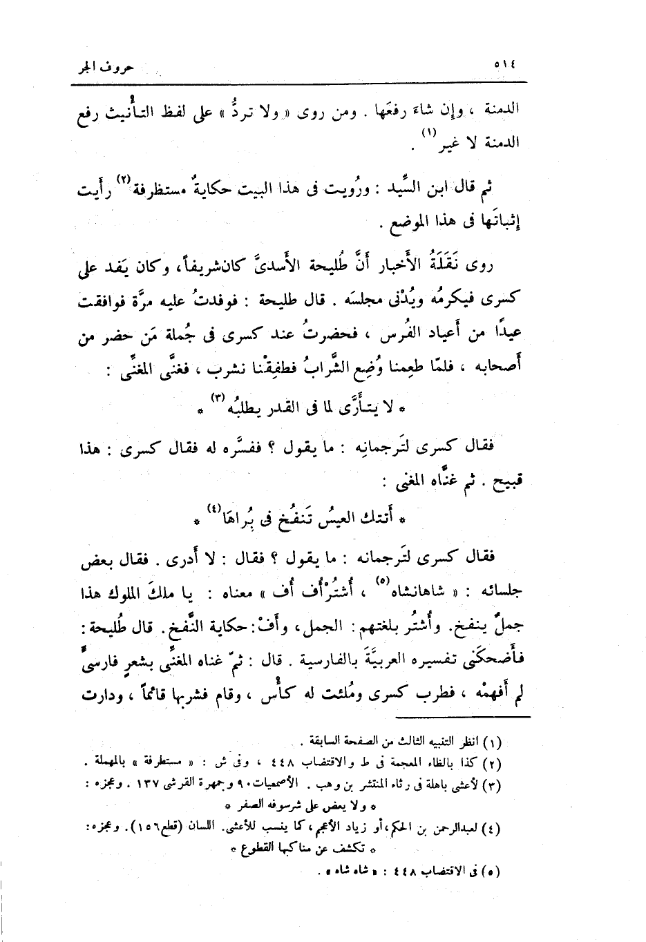 فَقَالَ كسْرَى لِترْجُمَانِهِ: مَا يَقُول فَقَالَ: لَا أَدْرِي. فَقَالَ بعض جُلَسَائِهِ: شاهانشاه أشتراف أُفٍّ مَعْنَاهُ: يَا ملك الْمُلُوك هَذَا جمل ينْفخ. واشتر بلغتهم: الْجمل وأف: حِكَايَة النفخ.