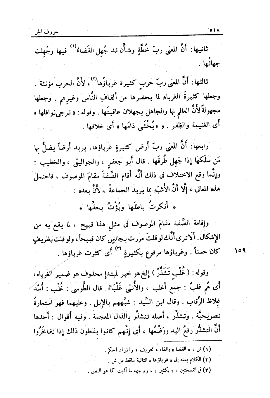 رَابِعهَا: أَن الْمَعْنى رب أَرض كَثِيرَة غرباؤها يُرِيد: أَرضًا يضل بهَا من سلكها إِذا جهل طرقها. قَالَ أَبُو جَعْفَر والجواليقي والخطيب: وَإِنَّمَا وَقع الِاخْتِلَاف فِي ذَلِك أَنه أَقَامَ الصّفة مقَام الْمَوْصُوف فَاحْتمل هَذَا الْمعَانِي إِلَّا أَن الْأَشْبَه بِمَا يرد الْجَمَاعَة لِأَن بعده: أنْكرت باطلها وبؤت بِحَقِّهَا وَإِقَامَة الصّفة مقَام الْمَوْصُوف فِي مثل هَذَا قَبِيح لما يَقع بِهِ من الْإِشْكَال.