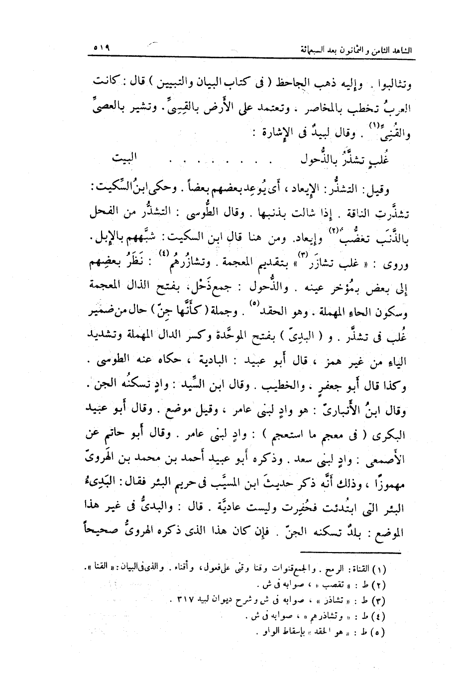 وَإِلَيْهِ ذهب الجاحظ فِي كتاب الْبَيَان والتبيين قَالَ: كَانَت الْعَرَب تخْطب بالمخاصر وتعتمد على الأَرْض بالقسي وتشير بِالْعِصِيِّ والقني. وَقَالَ لبيد فِي الْإِشَارَة: غلب تشذر بالذحول ... ... ... ... ... . الْبَيْت وَقيل: التشذر: الإيعاد أَي: يوعد بَعضهم بَعْضًا. وَحكى ابْن السّكيت: تشذرت النَّاقة. إِذا شالت بذنبها.
