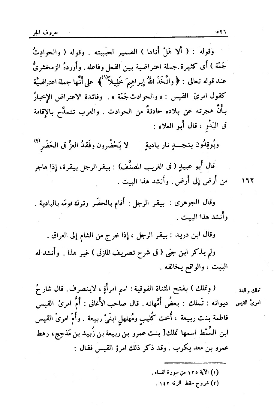 وَأوردهُ الزَّمَخْشَرِيّ عِنْد قَوْله تَعَالَى: وَاتخذ الله إِبْرَاهِيم خَلِيلًا على أَنَّهَا جملَة اعتراضية كَقَوْل امْرِئ الْقَيْس: والحوادث جمة وَفَائِدَة الِاعْتِرَاض الْإِخْبَار بِأَن هجرته عَن بِلَاده حَادِثَة من الْحَوَادِث. وَالْعرب تتمدح بِالْإِقَامَةِ فِي البدو قَالَ أَبُو الْعَلَاء: الْبَسِيط