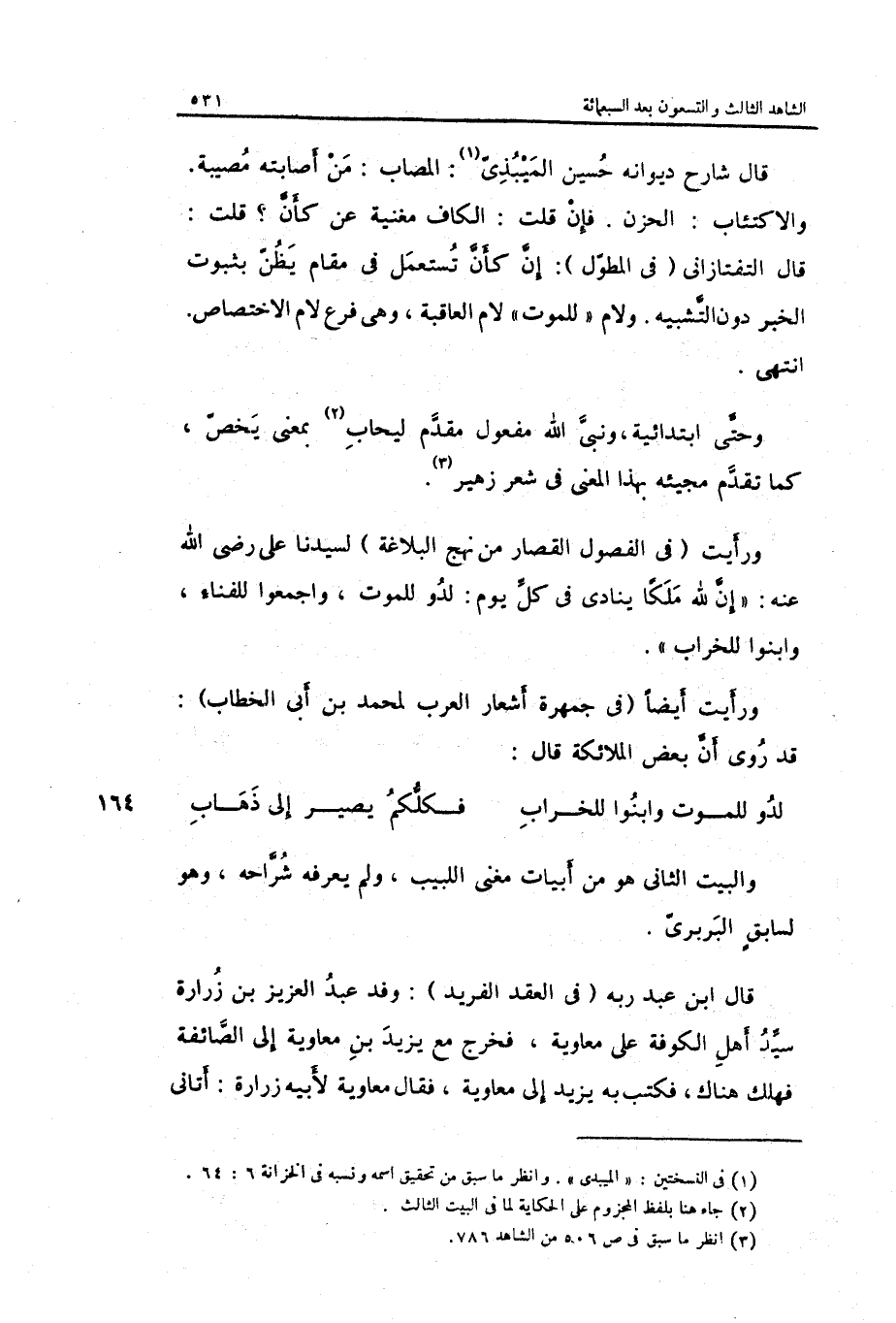قَالَ شَارِح ديوانه حُسَيْن الميبذي: الْمُصَاب: من أَصَابَته مُصِيبَة. والاكتئاب: الْحزن. فَإِن قلت: الْكَاف مغنية عَن كَأَن قلت: قَالَ التَّفْتَازَانِيّ فِي المطول: إِن كَأَن تسْتَعْمل فِي مقَام يظنّ بِثُبُوت الْخَبَر دون التَّشْبِيه. وَلَام للْمَوْت لَام الْعَاقِبَة وَهِي فرع لَام الِاخْتِصَاص. انْتهى.)