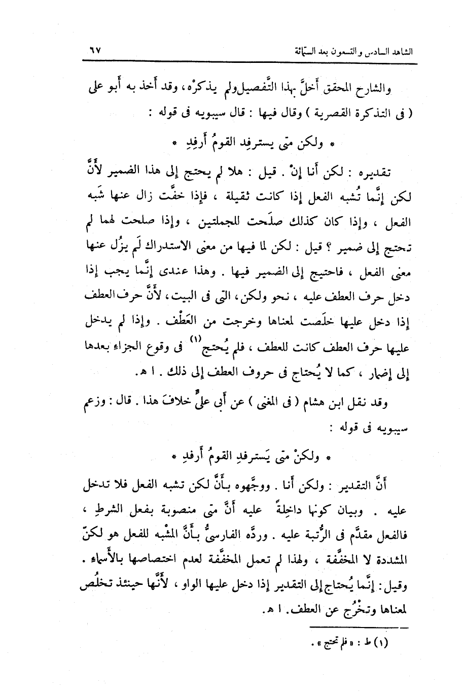 وَالشَّارِح الْمُحَقق أخل بِهَذَا التَّفْصِيل وَلم يذكرهُ وَقد أَخذ بِهِ أَبُو عَليّ فِي التَّذْكِرَة القصرية وَقَالَ فِيهَا: قَالَ سِيبَوَيْهٍ فِي قَوْله: وَلَكِن مَتى يسترفد الْقَوْم أرفد تَقْدِيره: وَلَكِن أَنا. إِن قيل هَذَا لم يحْتَج إِلَى الضَّمِير لِأَن لَكِن إِنَّمَا تشبه الْفِعْل إِذا كَانَت ثَقيلَة)