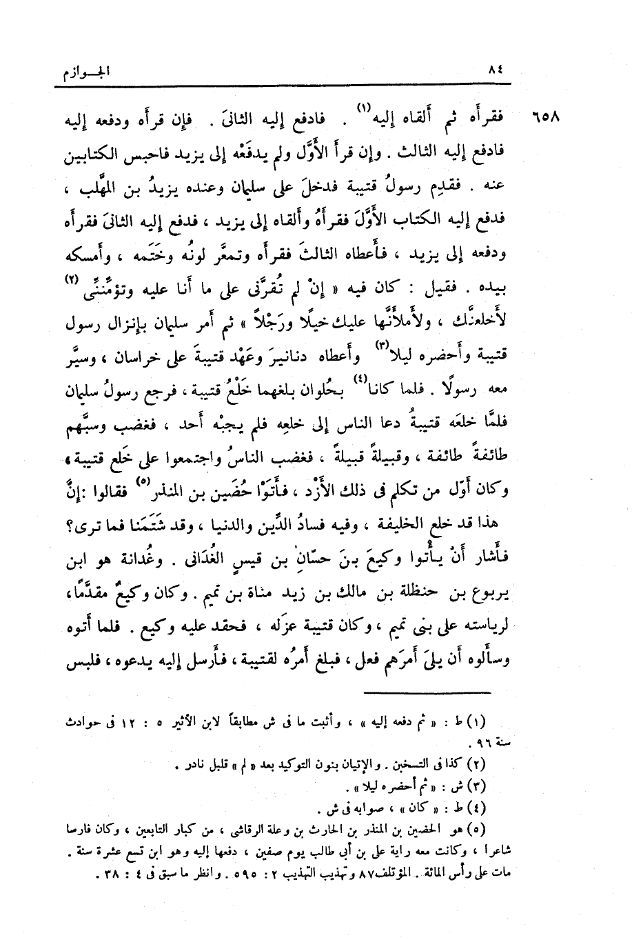فَقدم رَسُول قُتَيْبَة فَدخل على سُلَيْمَان، وَعِنْده يزِيد بن الْمُهلب، فَدفع إِلَيْهِ الْكتاب الأول، فقرأه، وألقاه إِلَى يزِيد، فَدفع إِلَيْهِ الثَّانِي، فقرأه، وَدفعه إِلَى يزِيد، فَأعْطَاهُ الثَّالِث فقرأه، وتمعر لَونه وختمه، وأمسكه بِيَدِهِ. فَقيل: كَانَ فِيهِ " إِن لم تقرني على مَا أَنا عَلَيْهِ وتؤمنني لأخلعنك، ولأمأنها عَلَيْك خيلاً ورجلاً ". ثمَّ أَمر سُلَيْمَان بإنزال رَسُول قُتَيْبَة، وأحضره لَيْلًا وَأَعْطَاهُ دَنَانِير وعهد قُتَيْبَة على خُرَاسَان، وسير مَعَه رَسُولا. فَلَمَّا كَانَا بحلوان، بلغهما خلع قُتَيْبَة، فَرجع رَسُول سُلَيْمَان. فَلَمَّا خلعه قُتَيْبَة، دَعَا النَّاس إِلَى خلعه، فَلم يجبهُ أحد. فَغَضب وسبهم طَائِفَة طَائِفَة، وقبيلة قَبيلَة، فَغَضب النَّاس واجتمعوا على خلع قُتَيْبَة، وَكَانَ أول من تكلم فِي ذَلِك الأزد، فَأتوا حضين بن الْمُنْذر، فَقَالُوا: إِن هَذَا قد خلع الْخَلِيفَة، وَفِيه فَسَاد الدَّين وَالدُّنْيَا، وَقد شَتمنَا فَمَا ترى؟ فَأَشَارَ أَن يَأْتُوا وَكِيع بن حسان بن قيس الغداني. وغدانة هُوَ ابْن يَرْبُوع بن حَنْظَلَة بن مَالك بن زيد مَنَاة بن تَمِيم. وَكَانَ وَكِيع مقدما، لرياسته على بني تَمِيم، وَكَانَ قُتَيْبَة عَزله، فحقد عَلَيْهِ وَكِيع فَلَمَّا أَتَوْهُ وسألوه أَن يَلِي أَمرهم فعل، فَبلغ أمره لقتيبة، فَأرْسل إِلَيْهِ يَدعُوهُ.