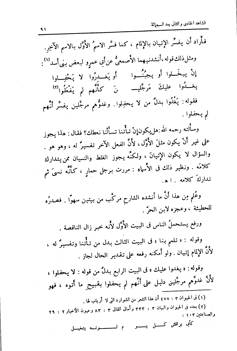 وَالنِّسْيَان مِمَّن يتدارك كَلَامه. وَنَظِير ذَلِك فِي الْأَسْمَاء: مَرَرْت بِرَجُل حمَار كَأَنَّهُ نسي ثمَّ وَعلم من هَذَا أَن من أنْشدهُ الشَّارِح مركب من بَيْتَيْنِ سَهوا. فصدره للحطيئة وعجزه لِابْنِ الْحر.