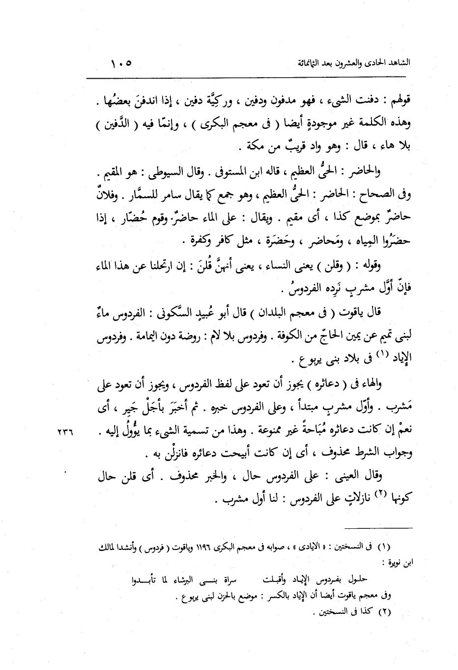 وَقَوله: وقلن يَعْنِي النِّسَاء يَعْنِي أَنَّهُنَّ قُلْنَ: إِن ارتحلنا عَن هَذَا المَاء فَإِن أول مشرب نرده قَالَ ياقوت فِي مُعْجم الْبلدَانِ قَالَ أَبُو عبيد السكونِي: الفردوس: مَاء لبني تَمِيم عَن يَمِين طَرِيق الْحَاج من الْكُوفَة. وفردوس بِلَا لَام: رَوْضَة دون الْيَمَامَة. وفردوس الإياد فِي بِلَاد بني يَرْبُوع.