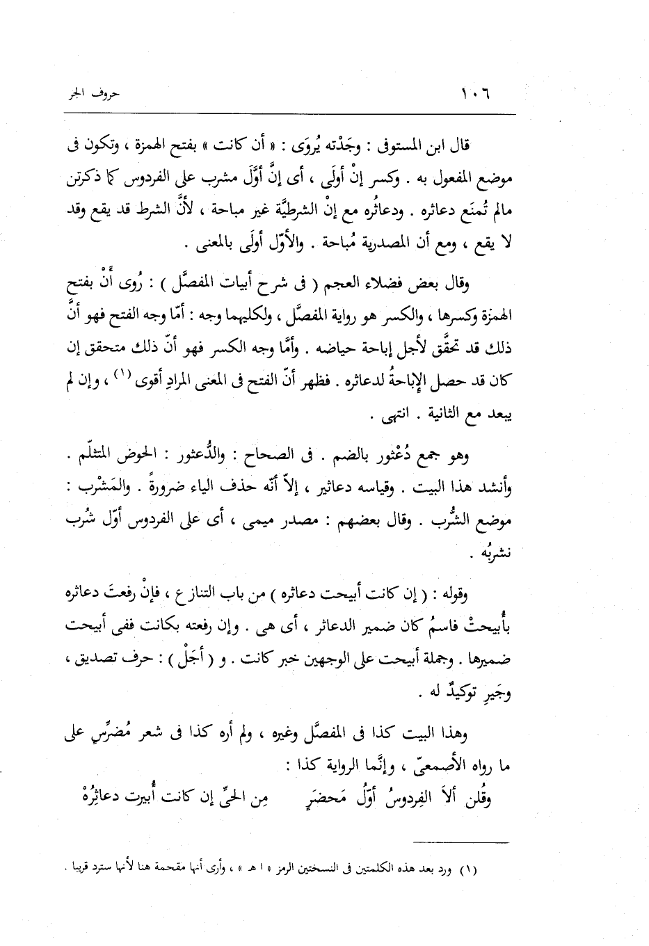 وَقَالَ بعض فضلاء الْعَجم فِي شرح أَبْيَات الْمفصل: رُوِيَ أَن بِفَتْح الْهمزَة وَكسرهَا وَالْكَسْر هُوَ رِوَايَة الْمفصل ولكليهما وَجه: أما وَجه الْفَتْح فَهُوَ أَن ذَلِك قد تحقق لأجل إِبَاحَة حياضه. وَأما وَجه الْكسر فَهُوَ أَن ذَلِك مُتَحَقق إِن كَانَ قد حصل الْإِبَاحَة لدعاثره. فَظهر أَن الْفَتْح فِي الْمَعْنى المُرَاد أقوى وَإِن لم يبعد مَعَ الثَّانِيَة. انْتهى.