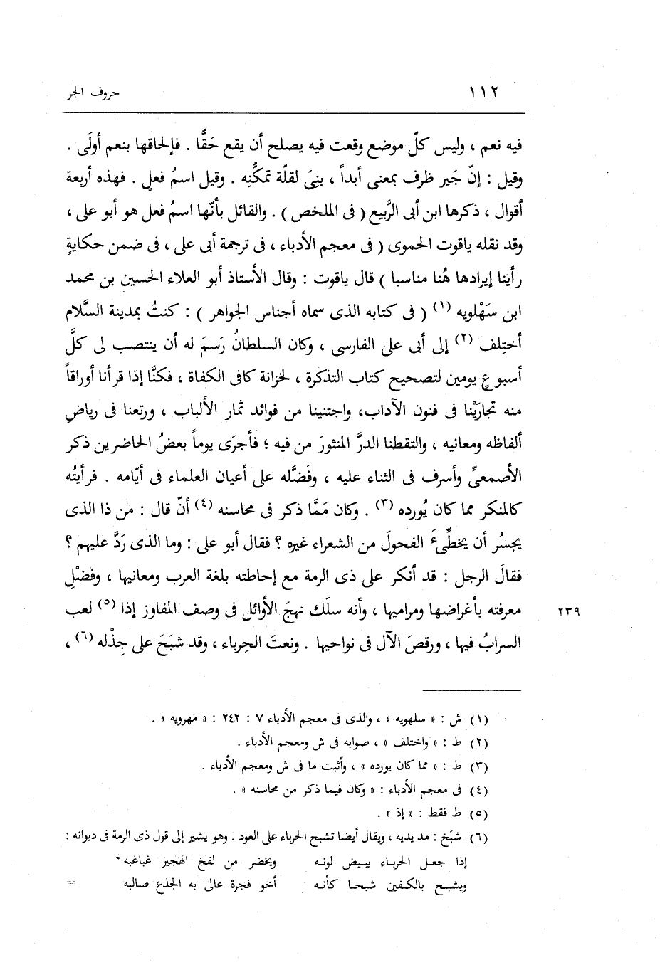 فَكُنَّا إِذا قَرَأنَا أوراقاً مِنْهُ تجارينا فِي فنون الْآدَاب واجتنينا من فَوَائِد ثمار الْأَلْبَاب ورتعنا فِي رياض أَلْفَاظه ومعانيه والتقطنا الدّرّ المنثور من فِيهِ فَأجرى يَوْمًا بعض الْحَاضِرين ذكر الْأَصْمَعِي وأسرف فِي الثَّنَاء عَلَيْهِ وفضله على أَعْيَان وَكَانَ مِمَّا ذكر فِي محاسنه أَن قَالَ: من ذَا الَّذِي يَجْسُر أَن يُخطئ الفحول من الشُّعَرَاء غَيره فَقَالَ أَبُو عَليّ: وَمَا الَّذِي رد عَلَيْهِم فَقَالَ الرجل: قد أنكر على ذِي الرمة مَعَ إحاطته بلغَة الْعَرَب ومعانيها وَفضل مَعْرفَته بأغراضها ومراميها وَأَنه سلك نهج الْأَوَائِل فِي صوف المفاوز إِذا لعب)