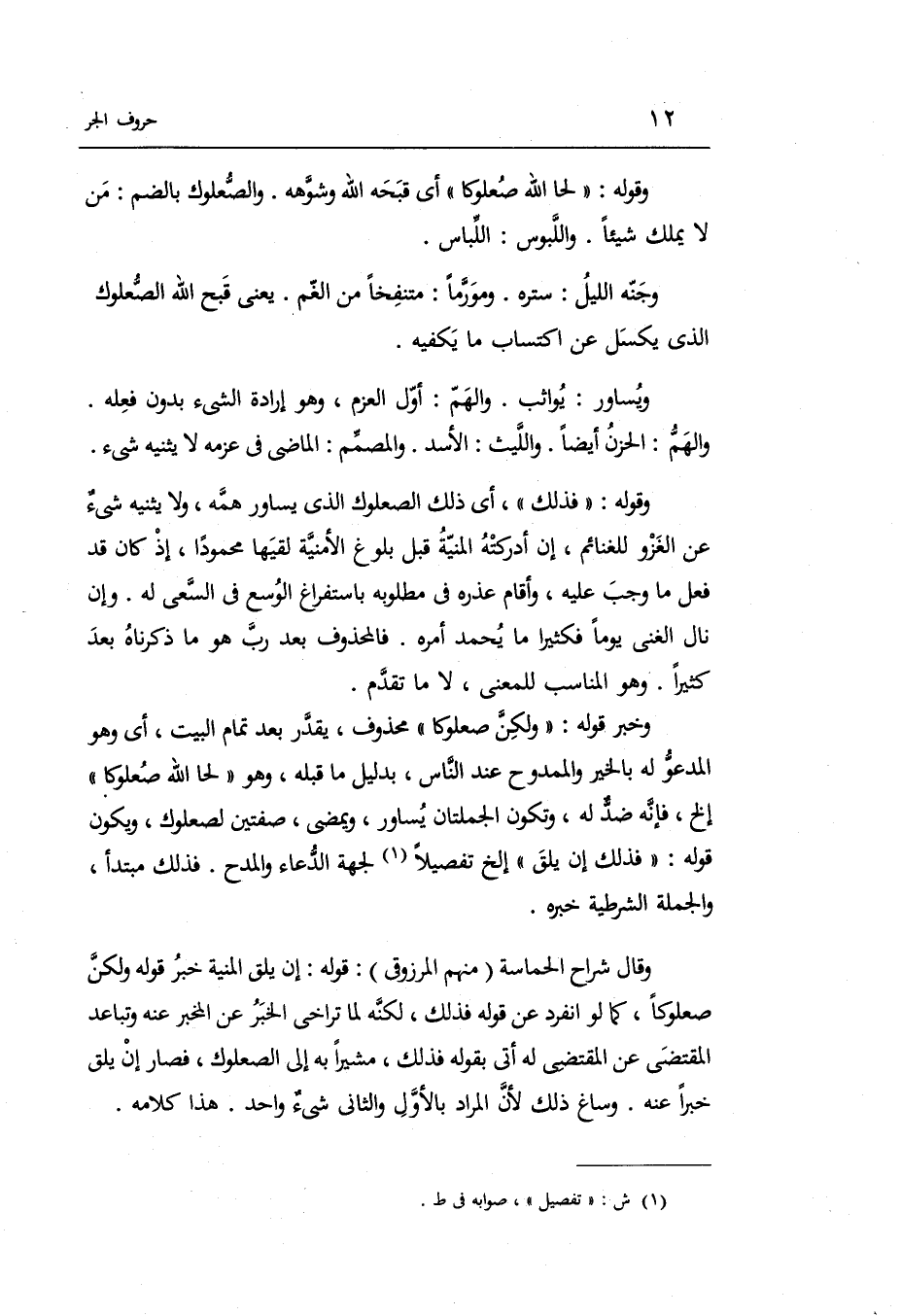 وَقَالَ شرَّاح الحماسة مِنْهُم المرزوقي: قَوْله: إِن يلق الْمنية خبر قَوْله: وَلَكِن صعلوكاً كَمَا لَو انْفَرد عَن قَوْله فَذَلِك لكنه لما ترَاخى الْخَبَر عَن الْمخبر عَنهُ وتباعد الْمُقْتَضى عَن الْمُقْتَضِي لَهُ أَتَى بقوله: فَذَلِك مُشِيرا بِهِ إِلَى الصعلوك فَصَارَ إِن يلق خَبرا عَنهُ. وساغ ذَلِك لِأَن المُرَاد بِالْأولِ وَالثَّانِي شَيْء وَاحِد. هَذَا كَلَامه.