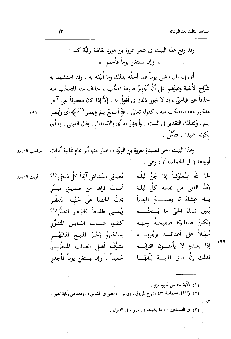 وَقد اسْتشْهد بِهِ شرَّاح الألفية وَغَيرهم على أَن أَجْدَر صِيغَة تعجب حذف مِنْهُ المتعجب مِنْهُ حذفا غير قياسي إِذْ لَا يجوز ذَلِك فِي أفعل بِهِ إِلَّا إِذا كَانَ مَعْطُوفًا على آخر مَذْكُور مَعَه المتعجب مِنْهُ كَقَوْلِه تَعَالَى: أسمع بهم وَأبْصر أَي: وَأبْصر بهم. وَكَذَلِكَ التَّقْدِير فِي الْبَيْت.)