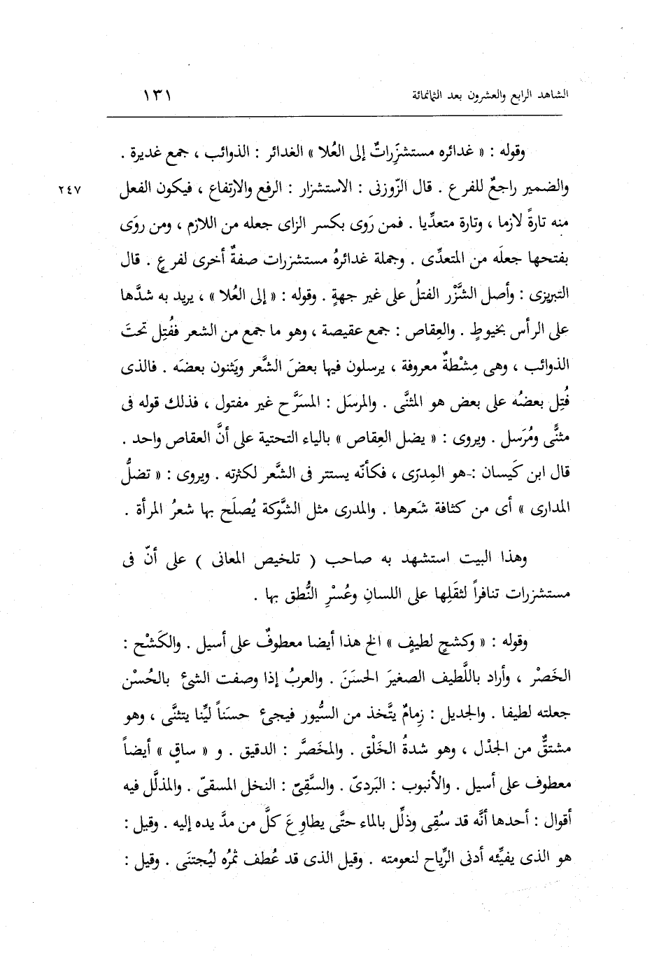 وَهَذَا الْبَيْت اسْتشْهد بِهِ صَاحب تَلْخِيص الْمعَانِي على أَن فِي مستشزرات تنافراً لثقلها على اللِّسَان وعسر النُّطْق بهَا.
