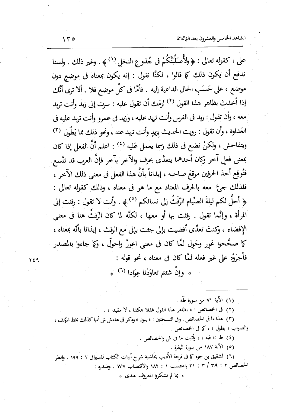 أَلا ترى أَنَّك إِذا أخذت بِظَاهِر هَذَا القَوْل لزمك أَن تَقول عَلَيْهِ: سرت إِلَى زيد وَأَنت تُرِيدُ مَعَه وَأَن تَقول: زيد فِي الْفرس وَأَنت تُرِيدُ عَلَيْهِ وَزيد فِي عَمْرو وَأَنت تُرِيدُ عَلَيْهِ الْعَدَاوَة وَأَن تَقول: رويت الحَدِيث بزيد وَأَنت تُرِيدُ عَنهُ وَنَحْو ذَلِك مِمَّا يطول ويتفاحش وَلَكِن نضع فِي ذَلِك رسماً يعْمل عَلَيْهِ.