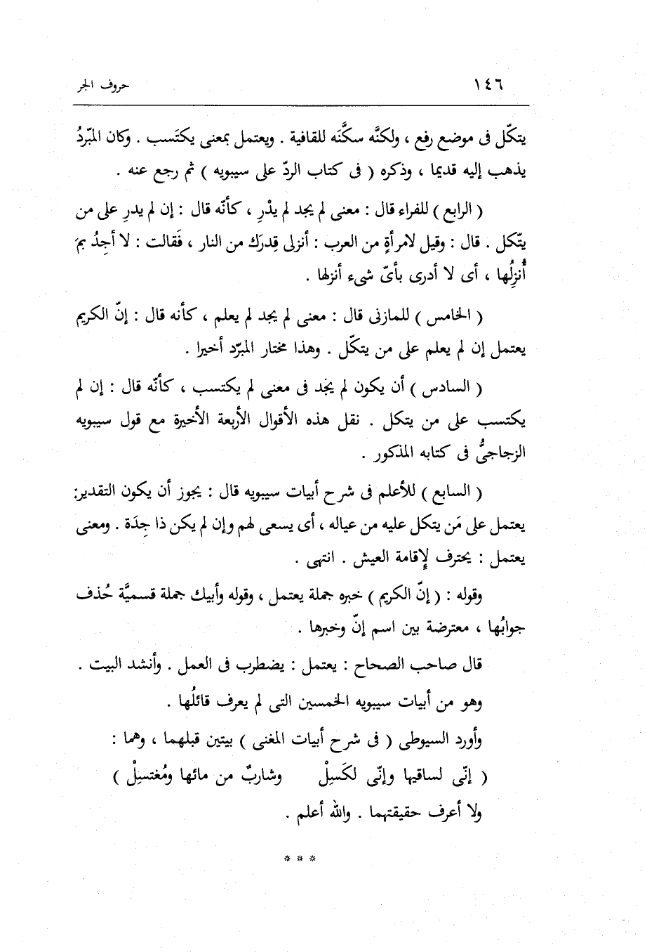 الْخَامِس للمازني قَالَ: معنى لم يجد: لم يعلم كَأَنَّهُ قَالَ: إِن الْكَرِيم يعتمل إِن لم يعلم على من يتكل. وَهَذَا مُخْتَار الْمبرد أخيراً.