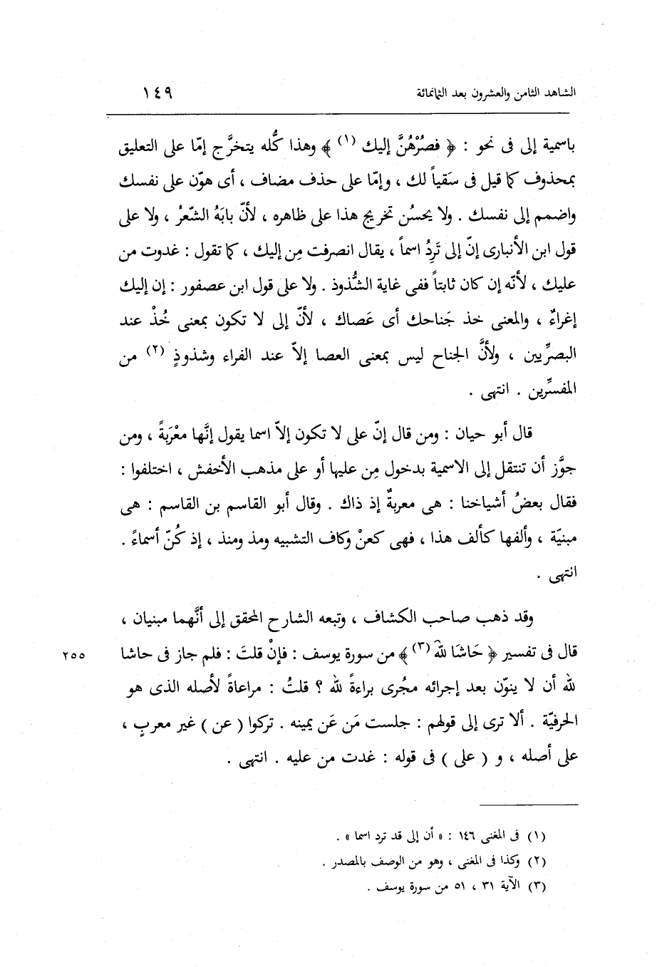 باسمية إِلَى فِي نَحْو: فصرهن إِلَيْك وَهَذَا كُله يتَخَرَّج إِمَّا على التَّعْلِيق بِمَحْذُوف كَمَا قيل: فِي سقيا لَك وَإِمَّا على حذف مُضَاف أَي: هون على نَفسك واضمم إِلَى نَفسك.