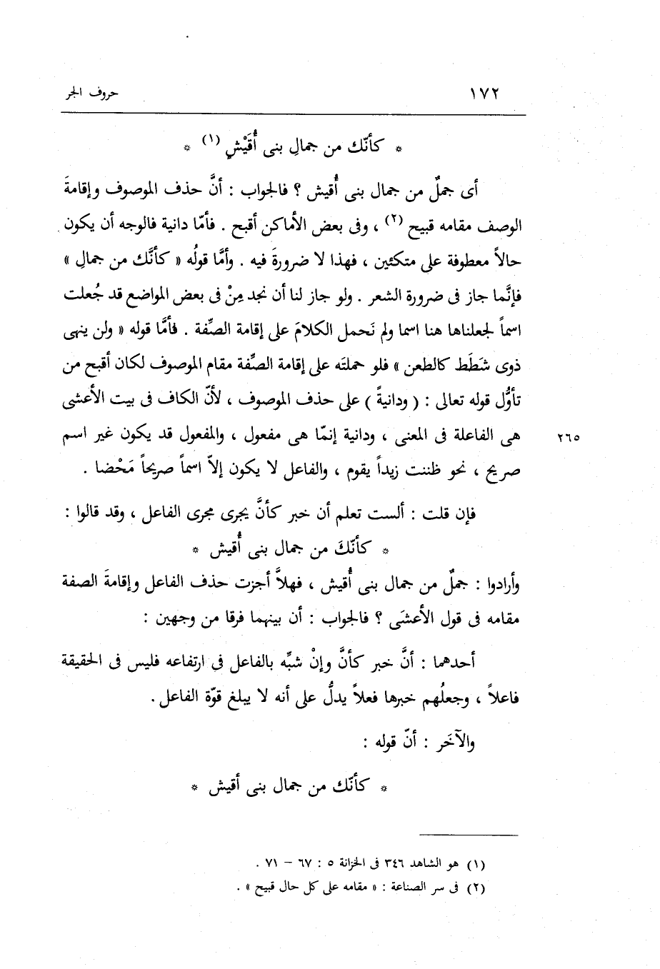 فَأَما قَوْله: وَلنْ ينْهَى ذَوي شطط كالطعن فَلَو حَملته على إِقَامَة الصّفة مقَام الْمَوْصُوف لَكَانَ أقبح من تَأَول قَوْله تَعَالَى: ودانية على حذف الْمَوْصُوف لِأَن الْكَاف فِي بَيت الْأَعْشَى هِيَ)