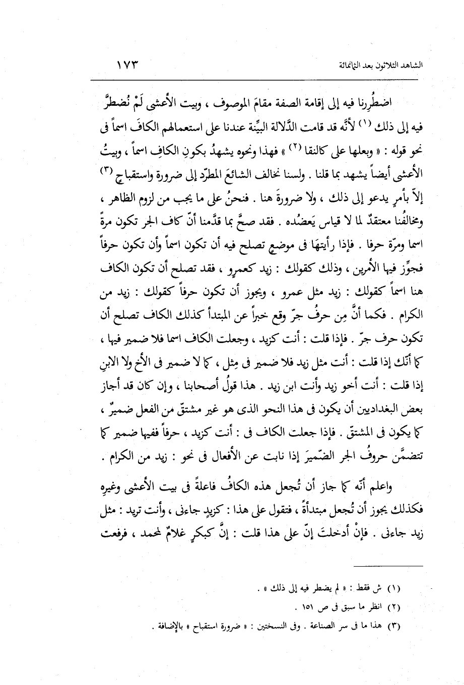 اضطررنا فِيهِ إِلَى إِقَامَة الصّفة مقَام الْمَوْصُوف وَبَيت الْأَعْشَى لم نضطر فِيهِ إِلَى ذَلِك لِأَنَّهُ قد قَامَت الدّلَالَة الْبَيِّنَة عندنَا على استعمالهم الْكَاف اسْما فِي نَحْو قَوْله: وبعلها على كالنقا فَهَذَا وَنَحْوه يشْهد بِكَوْن الْكَاف اسْما وَبَيت الْأَعْشَى أَيْضا يشْهد بِمَا قُلْنَا. ولسنا نخالف الشَّائِع المطرد إِلَى ضَرُورَة واستقباح إِلَّا بِأَمْر يَدْعُو إِلَى ذَلِك وَلَا ضَرُورَة هُنَا. فَنحْن على مَا يجب من لُزُوم الظَّاهِر ومخالفنا مُعْتَقد لما لَا قِيَاس يعضده. فقد صَحَّ بِمَا قدمنَا أَن كَاف الْجَرّ تكون مرّة اسْما وَمرَّة حرفا. فَإِذا رَأَيْتهَا فِي مَوضِع تصلح فِيهِ أَن تكون اسْما وَأَن تكون حرفا فجوز فِيهَا الْأَمريْنِ وَذَلِكَ كَقَوْلِك: زيد كعمرو فقد تصلح أَن تكون الْكَاف هُنَا اسْما كَقَوْلِك: زيد مثل عَمْرو وَيجوز أَن تكون حرفا كَقَوْلِك: زيد من الْكِرَام. فَكَمَا أَن من حرف جر وَقع خَبرا عَن الْمُبْتَدَأ كَذَلِك الْكَاف تصلح أَن تكون حرف جر.