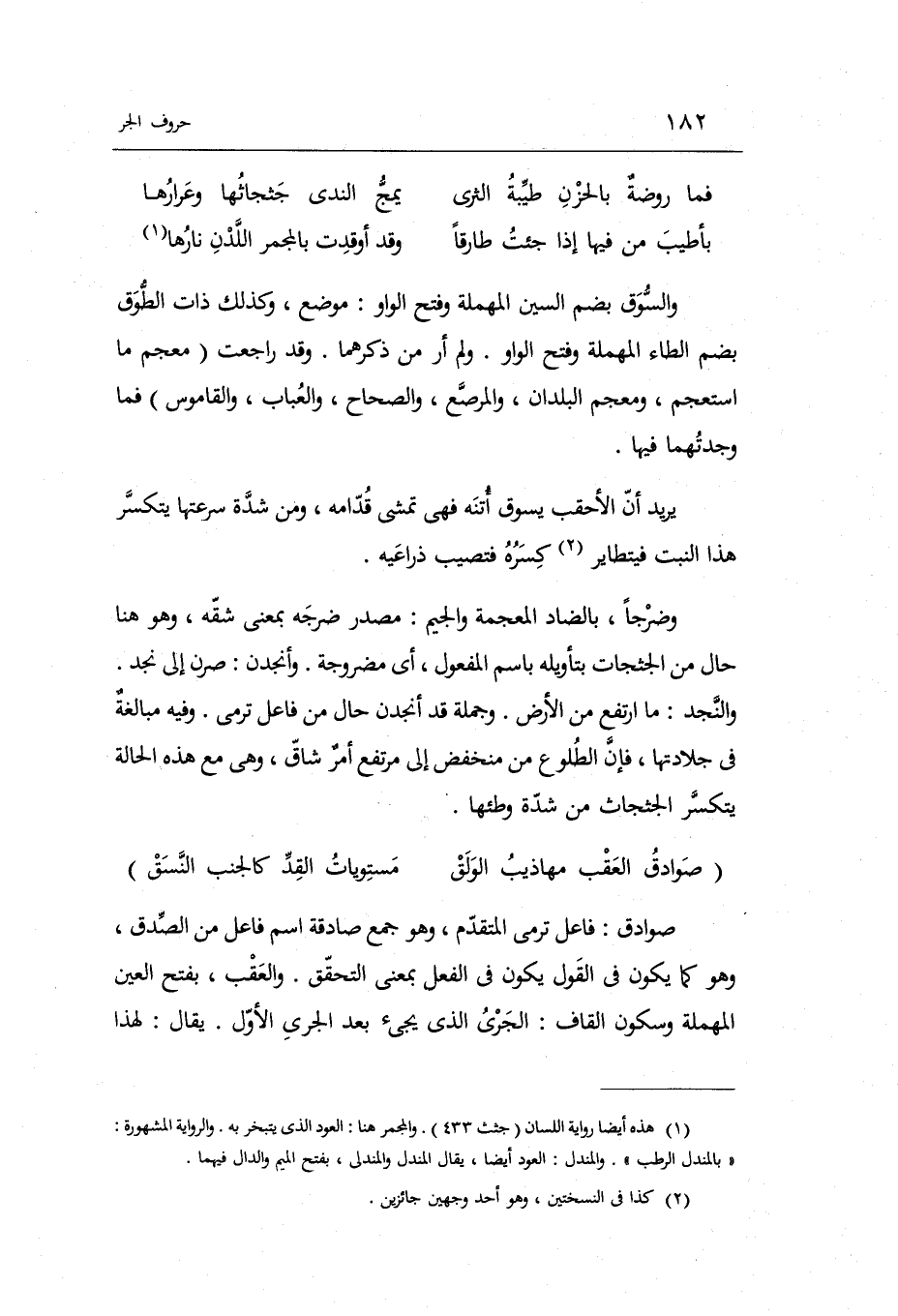 (فَمَا رَوْضَة بالحزن طيبَة الثرى ... يمج الندى جثجاثها وعرارها)
