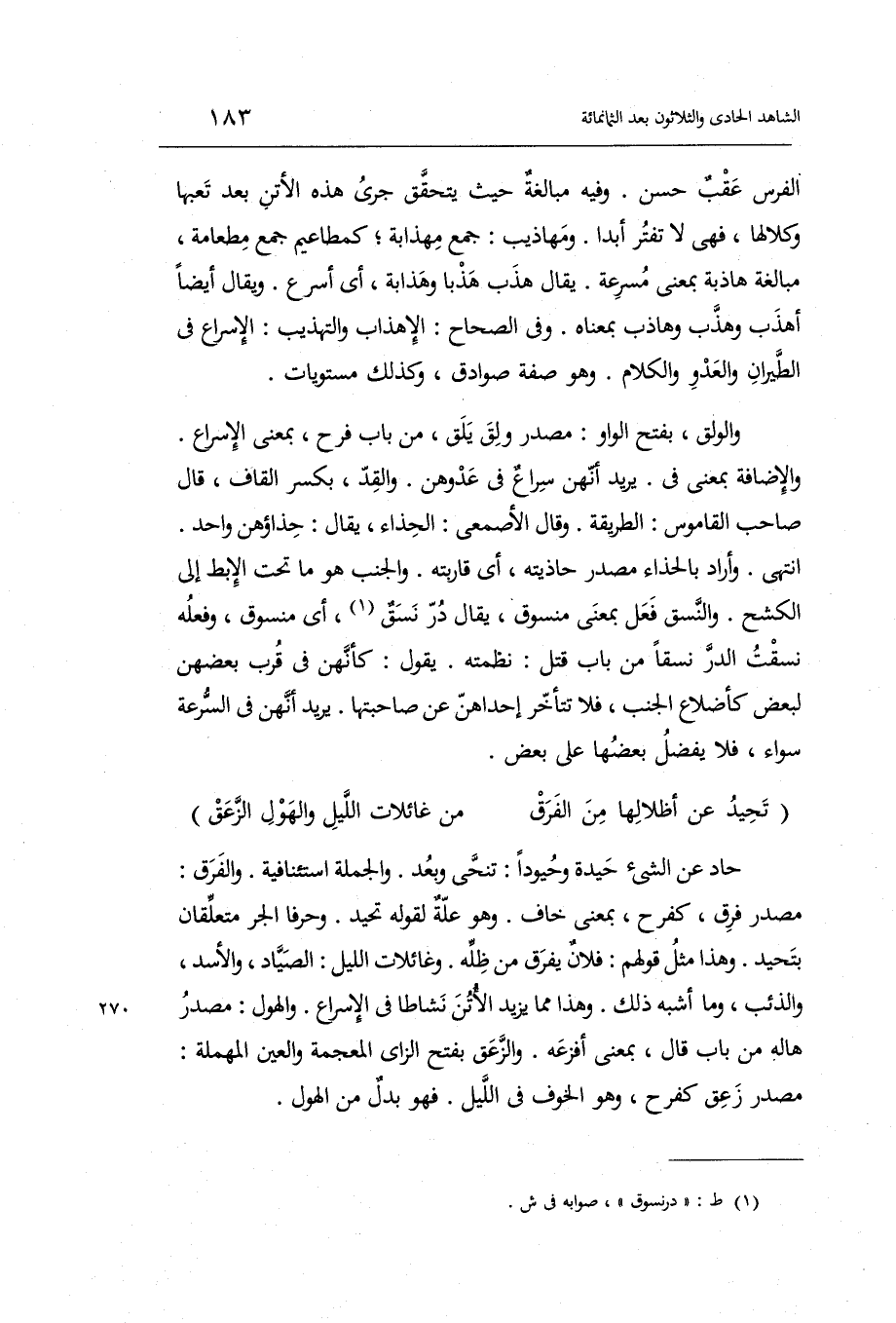 فَهِيَ لَا تفتر أبدا. ومهاذيب: جمع مهذابة كمطاعيم جمع مطعامة مُبَالغَة هاذبة بِمَعْنى مسرعة.