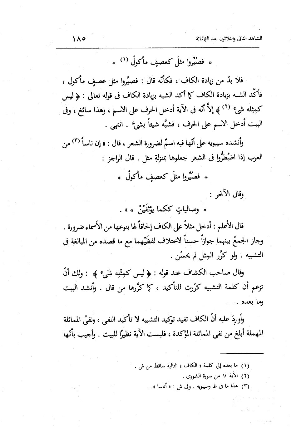 فصيروا مثل كعصف مَأْكُول فَلَا بُد من زِيَادَة الْكَاف فَكَأَنَّهُ قَالَ: فصيروا مثل عصف مَأْكُول فأكد الشّبَه بِزِيَادَة الْكَاف كَمَا أكد الشّبَه بِزِيَادَة الْكَاف فِي قَوْله تَعَالَى: لَيْسَ كمثله