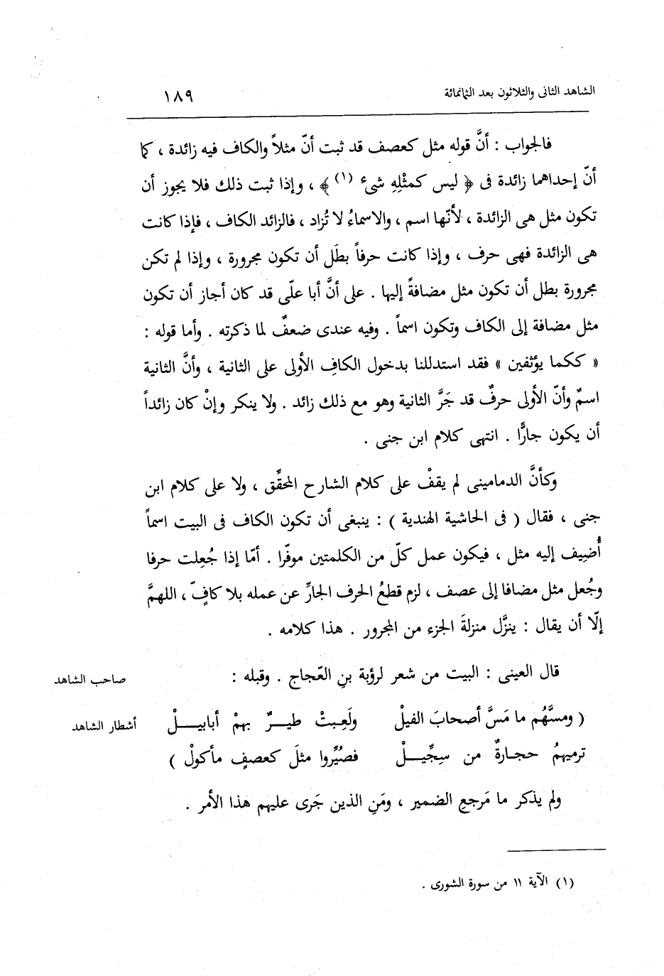 وَكَأن الدماميني لم يقف على كَلَام الشَّارِح الْمُحَقق وَلَا على كَلَام ابْن جني فَقَالَ فِي الْحَاشِيَة الْهِنْدِيَّة: يَنْبَغِي أَن تكون الْكَاف فِي الْبَيْت اسْما أضيف إِلَيْهِ مثل فَيكون عمل كل من الْكَلِمَتَيْنِ موفراً. أما إِذا جعلت حرفا وَجعل مثل مُضَافا إِلَى عصف لزم قطع الْحَرْف الْجَار عَن عمله بِلَا كَاف اللَّهُمَّ إِلَّا أَن يُقَال: ينزل منزلَة الْجُزْء من الْمَجْرُور. هَذَا كَلَامه.