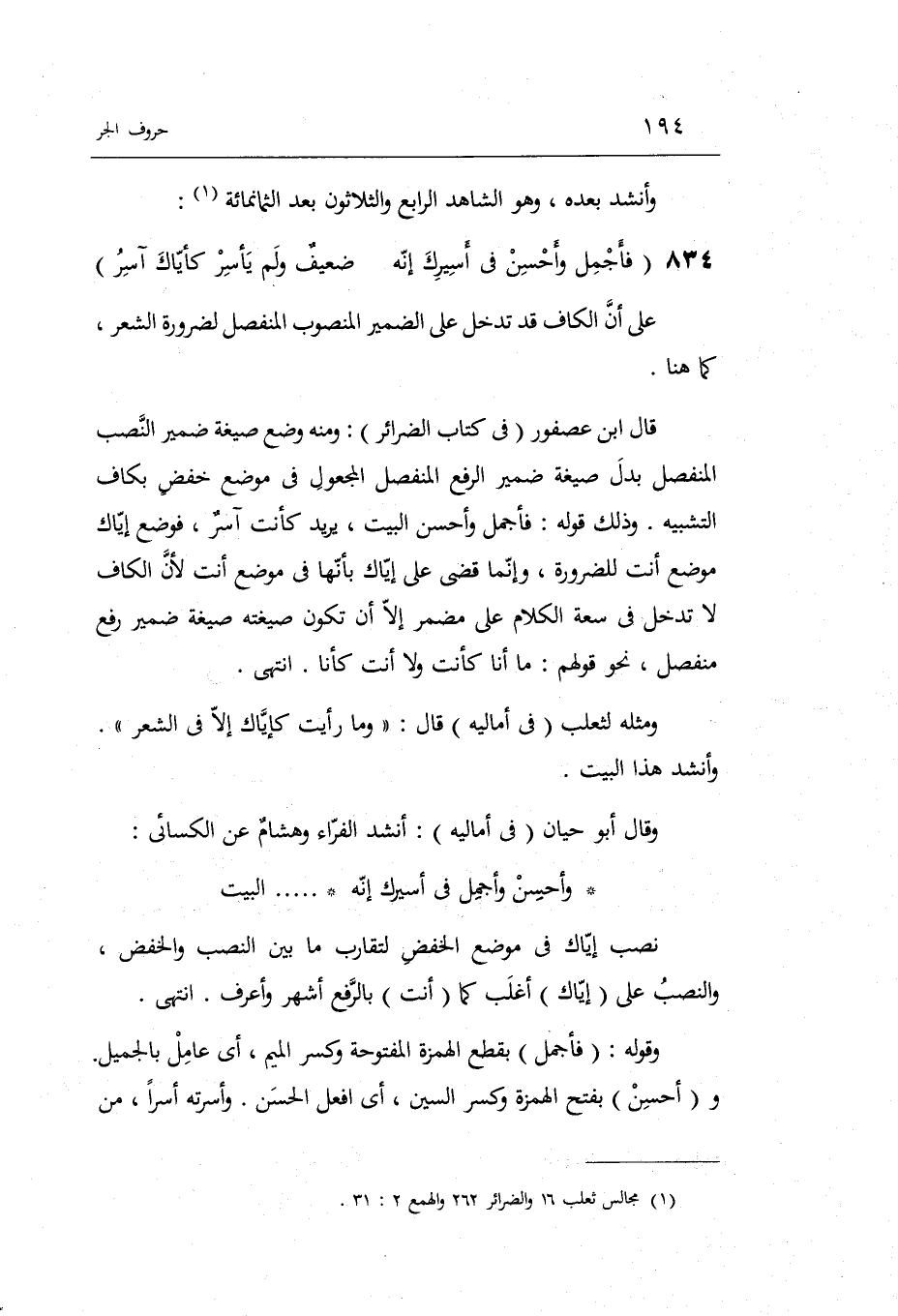 قَالَ ابْن عُصْفُور فِي كتاب الضرائر: وَمِنْه وضع صِيغَة ضمير النصب الْمُنْفَصِل بدل صِيغَة ضمير الرّفْع الْمُنْفَصِل المجعول فِي مَوضِع خفض بكاف التَّشْبِيه. وَذَلِكَ قَوْله: فأجمل وَأحسن ... ... . . الْبَيْت يُرِيد: كَأَنْت آسر فَوضع إياك مَوضِع أَنْت للضَّرُورَة وَإِنَّمَا قضى على إياك بِأَنَّهَا فِي مَوضِع أَنْت لِأَن الْكَاف لَا تدخل فِي سَعَة الْكَلَام على مُضْمر إِلَّا أَن تكون صيغته ضمير رفع مُنْفَصِل نَحْو قَوْلهم: مَا أَنا كَأَنْت وَلَا أَنْت كأنا. انْتهى.