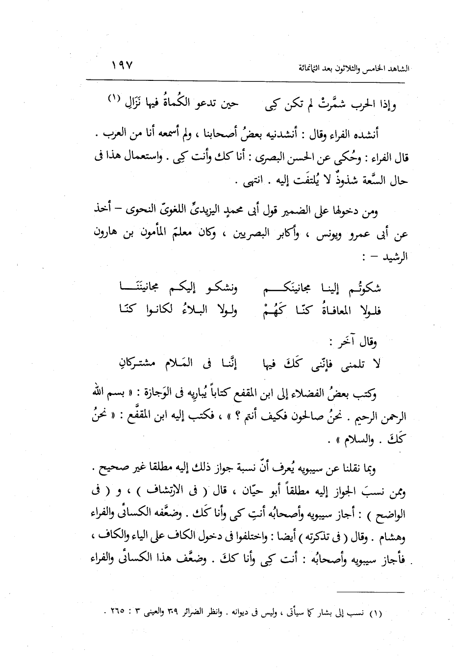 وَإِذا الْحَرْب شمرت لم تكن كي حِين تَدْعُو الكماة فِيهَا نزال أنْشدهُ الْفراء وَقَالَ: أنشدنيه بعض أَصْحَابنَا وَلم أسمعهُ أَنا من الْعَرَب. قَالَ الْفراء: وَحكي عَن الْحسن الْبَصْرِيّ: أَنا كك وَأَنت كي. وَاسْتِعْمَال هَذَا فِي حَال السعَة شذوذ لَا يلْتَفت إِلَيْهِ.