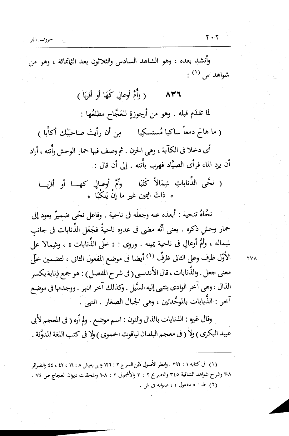 إِلَى أَن قَالَ: ذَات الْيَمين غير مَا أَن ينكبا نحاه تنحية: أبعده عَنهُ وَجعله فِي نَاحيَة. وفاعل نحى ضمير يعود إِلَى حمَار وَحش ذكره. يَعْنِي أَنه مضى فِي عدوه نَاحيَة فَجعل الذنابات فِي جَانب شِمَاله وَأم أوعال فِي نَاحيَة يَمِينه. وروى خلى الذنابات وَشمَالًا على الأول ظرف وعَلى الثَّانِي ظرف أَيْضا فِي وضع الْمَفْعُول الثَّانِي لتضمين خلى معنى جعل.