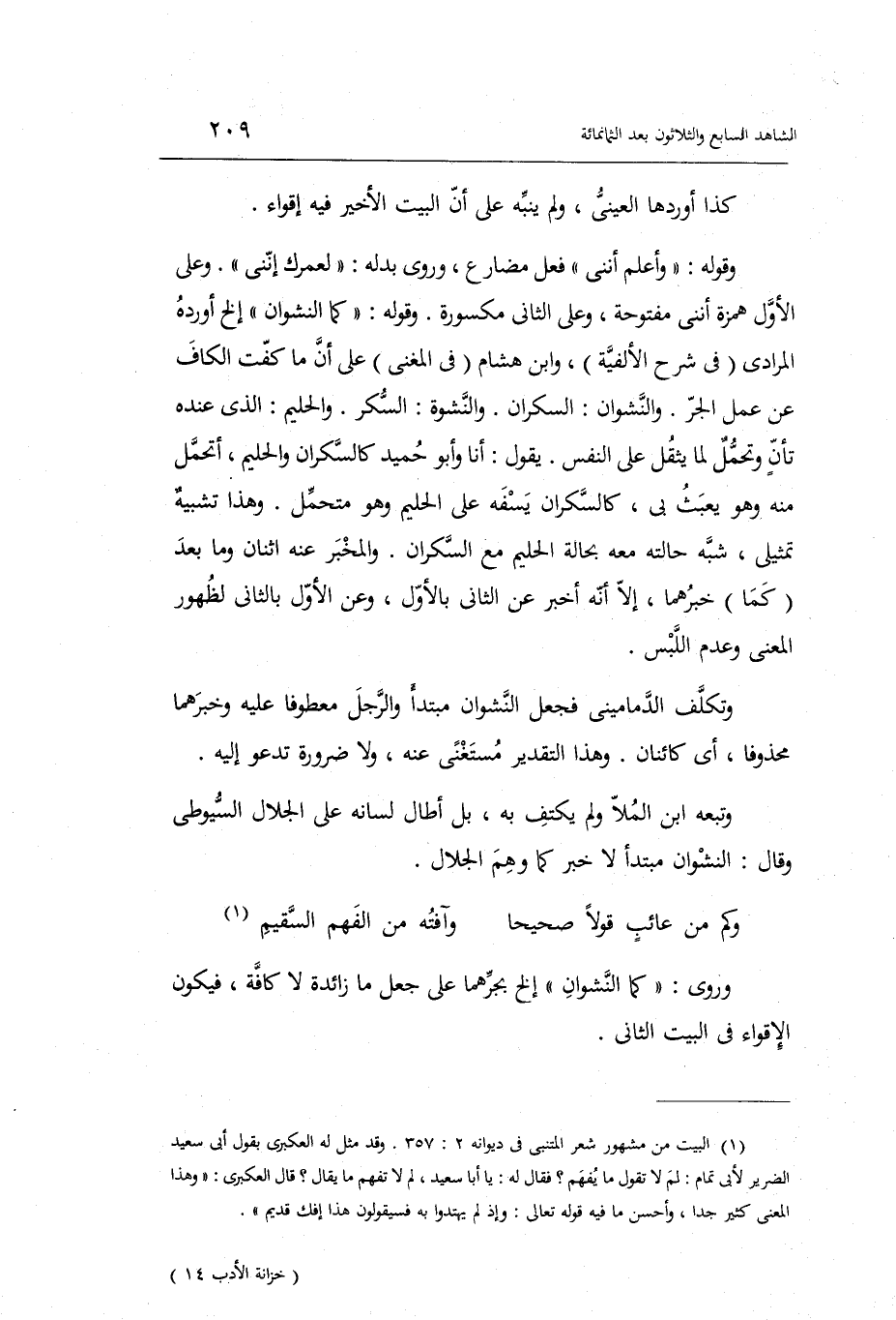 وتكلف الدماميني فَجعل النشوان: مُبْتَدأ وَالرجل: مَعْطُوفًا عَلَيْهِ وخبرهما محذوفاً أَي: وَتَبعهُ ابْن الملا وَلم يكتف بِهِ بل أَطَالَ لِسَانه على الْجلَال السُّيُوطِيّ وَقَالَ: النشوان: مُبْتَدأ لَا خبر كَمَا وهم الْجلَال: