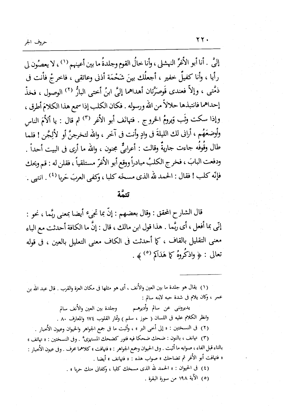 فَكَانَ الْكَلْب إِذا سمع هَذَا الْكَلَام أطرق وَإِذا سكت وثب ويروم الْخُرُوج. فتهاتف أَبُو الْأَغَر ثمَّ قَالَ: يَا ألأم النَّاس وأوضعهم أَرَانِي لَك اللَّيْلَة فِي وَاد وَأَنت فِي آخر وَالله لتخْرجن أَو لألجن فَلَمَّا طَال وُقُوفه جَاءَت جَارِيَة وَقَالَت: أَعْرَابِي مَجْنُون وَالله مَا أرى فِي الْبَيْت أحدا. وَدفعت الْبَاب فَخرج الْكَلْب مبادراً وَوَقع أَبُو الْأَغَر مُسْتَلْقِيا فَقُلْنَ لَهُ: قُم وَيحك فَإِنَّهُ كلب فَقَالَ: الْحَمد لله الَّذِي مسخه كَلْبا وَكفى الْعَرَب حَربًا. انْتهى.
