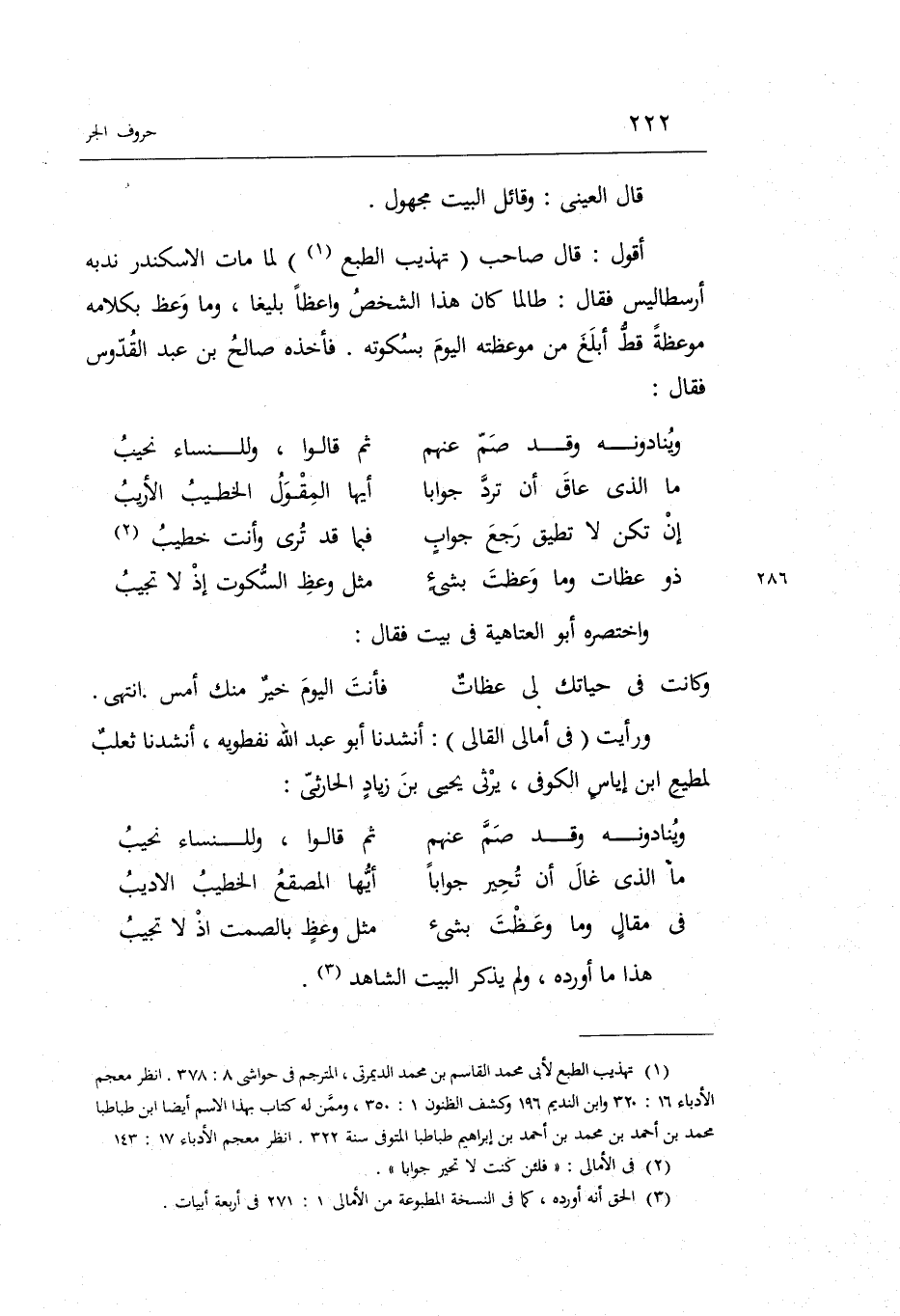 (فِي مقَال وَمَا وعظت بِشَيْء ... مثل وعظ بِالصَّمْتِ إِذْ لَا تجيب)