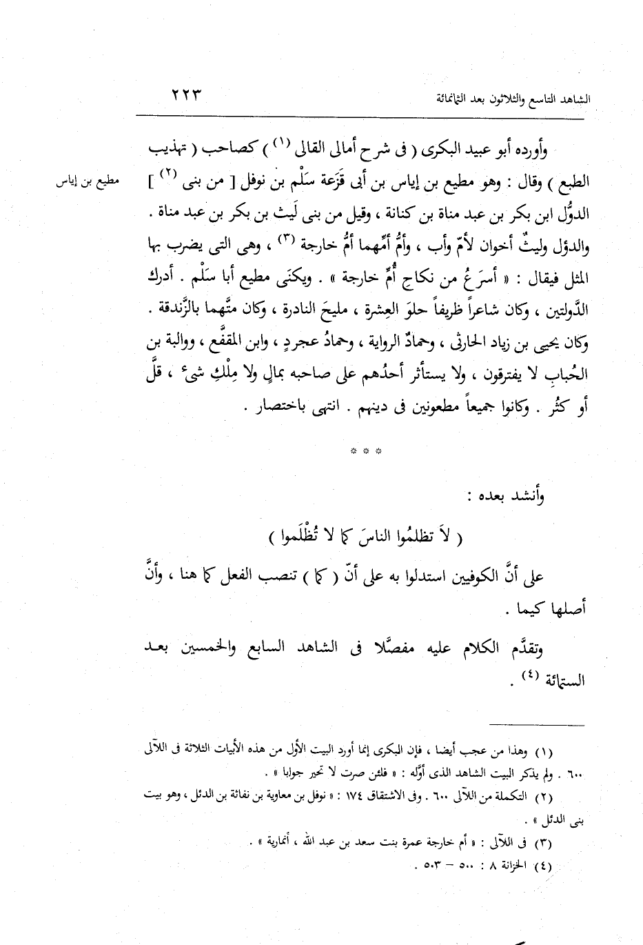 وَأوردهُ أَبُو عبيد الْبكْرِيّ فِي شرح أمالي القالي كصاحب تَهْذِيب الطَّبْع وَقَالَ: مُطِيع بن إِيَاس بن أبي قزعة سلم بن نَوْفَل من بني الدول ابْن بكر بن عبد مَنَاة بن كنَانَة.